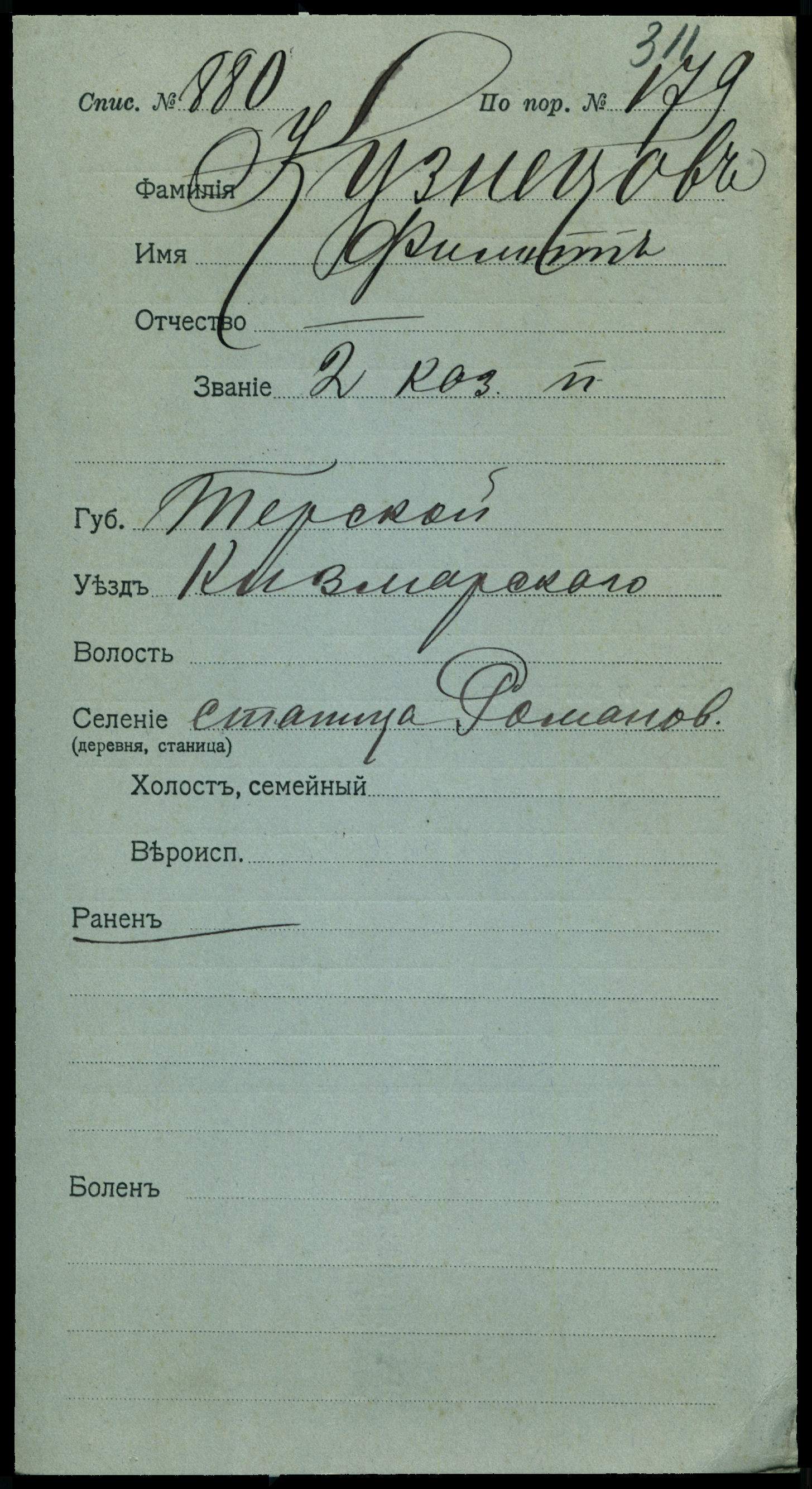 Сержант, __.__.1905 Грозненская обл., Сунженский р-н, с. Закан-Юрт. Сводная картотека