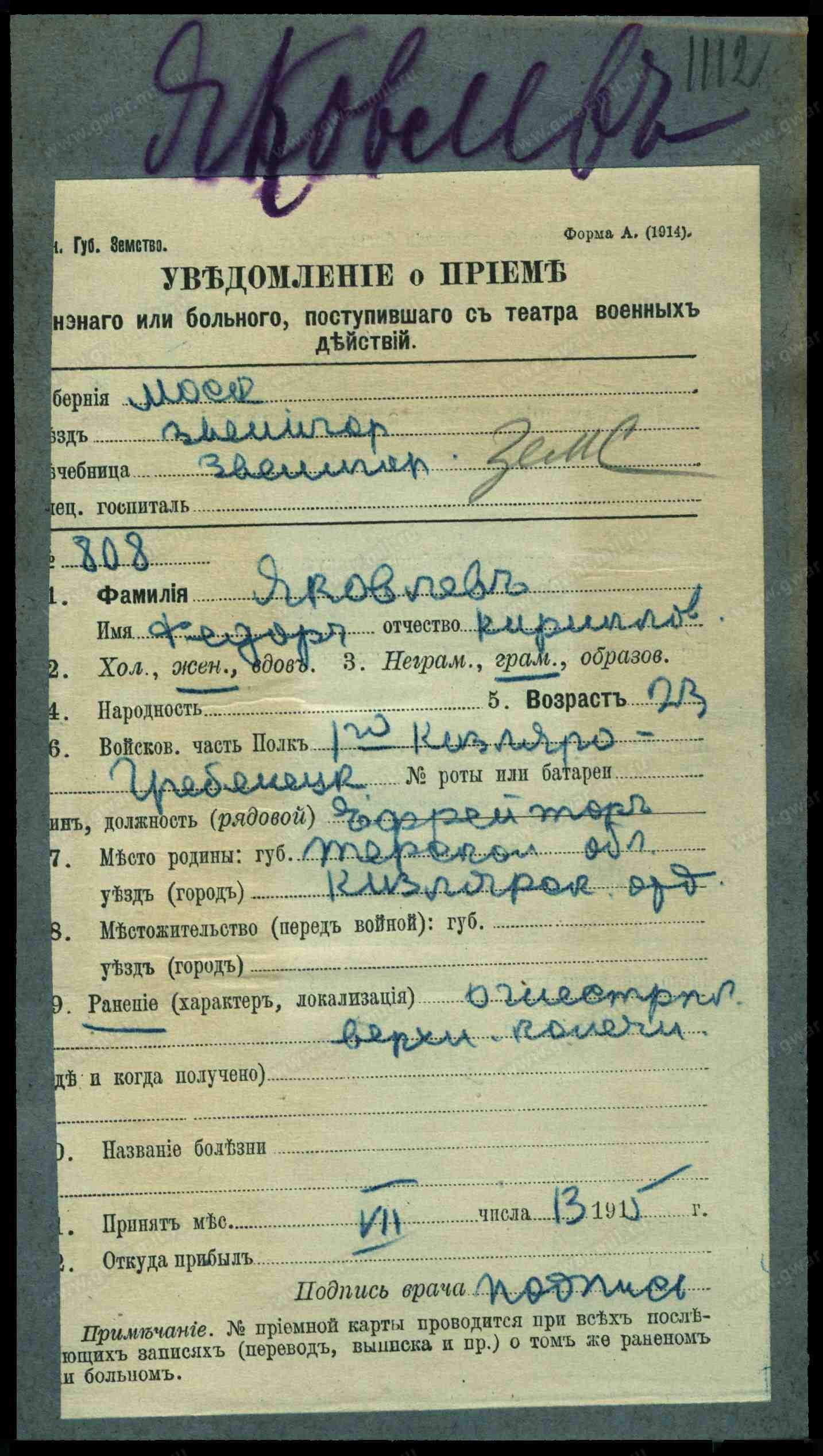 Мл. ур. Яковлев Филипп Николаевич, 1 сотня 1-го Кизляро-Гребенского полка, старообр., жен., ст. Ермоловской, Терской обл., Кизлярского отд., ранен 5 июня 1915 г. у д. Гуры, отправлен в полевой лазарет.