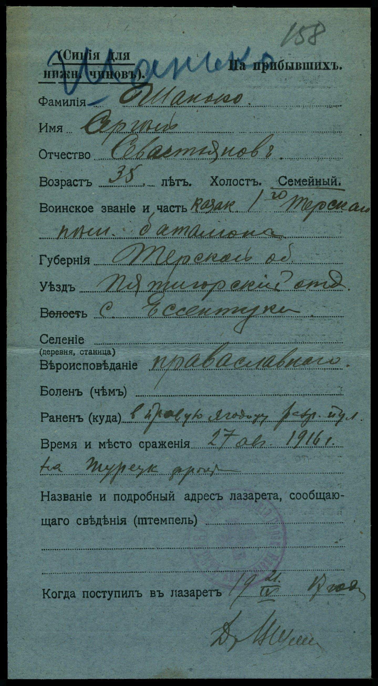 Ст. сержант __.__.1896 Ставропольский край, г. Ессентуки. Сводная картотека