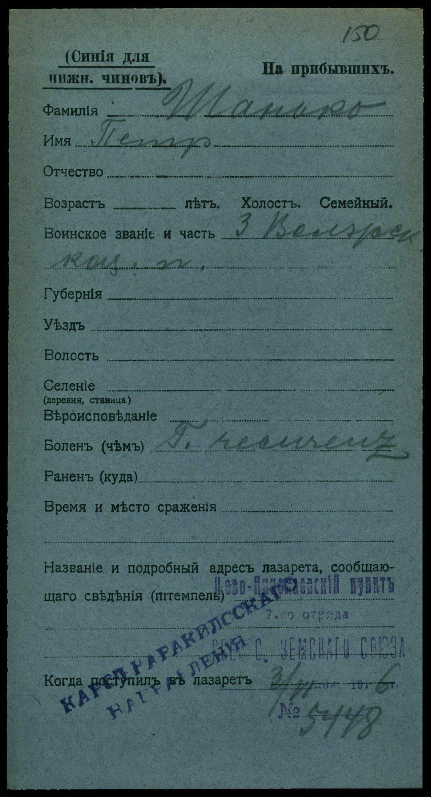 Тип документа Карточка на прибывших (нижние чины)