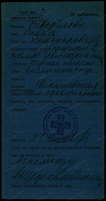 Прик. Погорелов Павел Никонорович, 4 сотня, правос., жен., ст. Николаевской, Терской обл., Кизлярского отд., ранен 25 авг. 1915, с. Дорохов, госпиталь м. Терембовля.