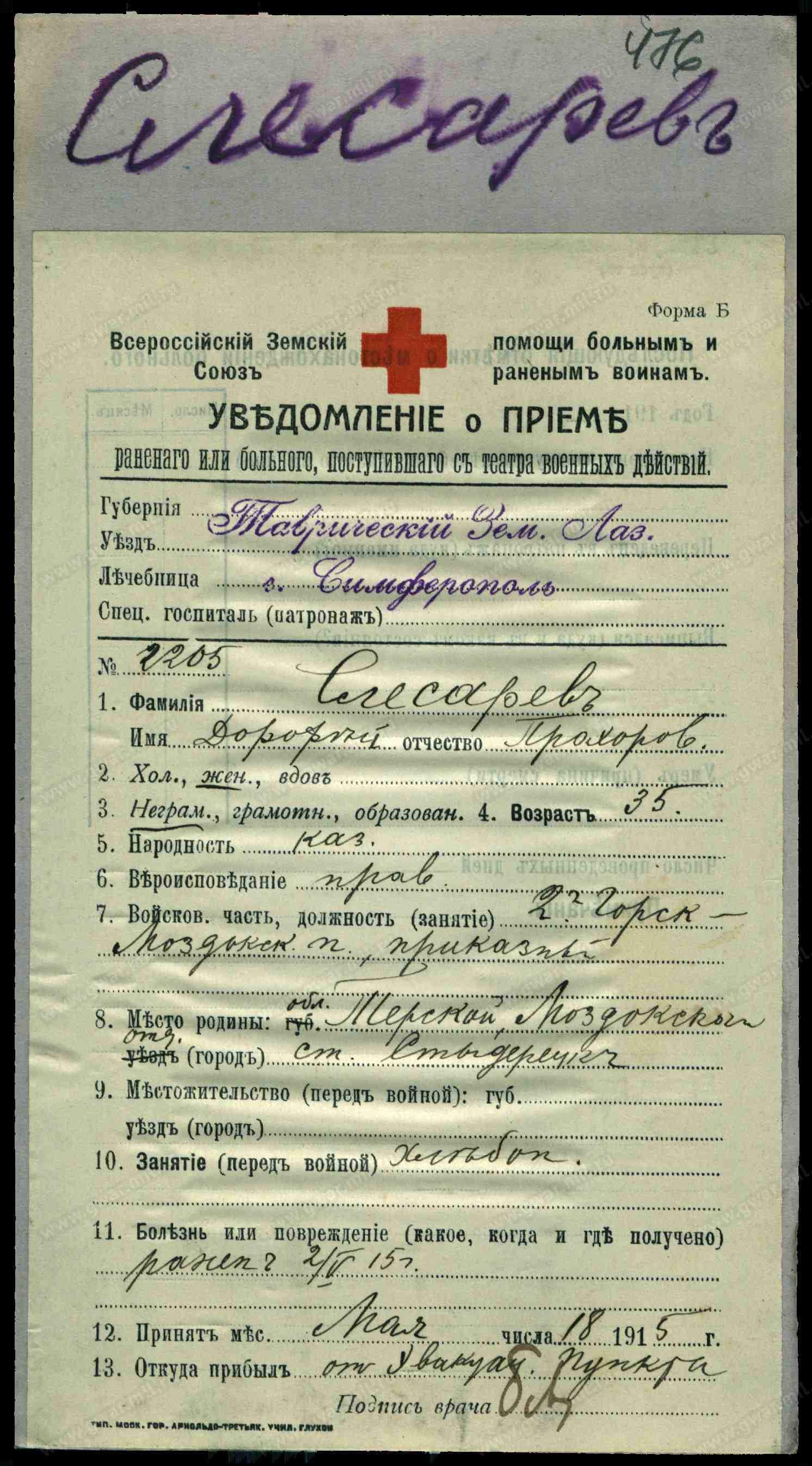 Родители: Старший урядник станицы Стодеревской, Терской обл., Георгий Прохоров Слесарев и законная жена его Александра Гавриилова, оба православного вероисповедания.