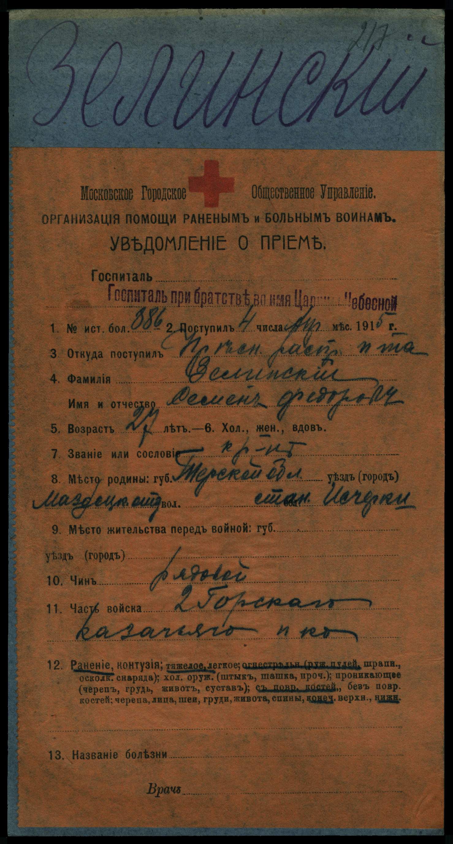 Место рождения Терская обл., Моздокский отдел, стнц. Исчерки
