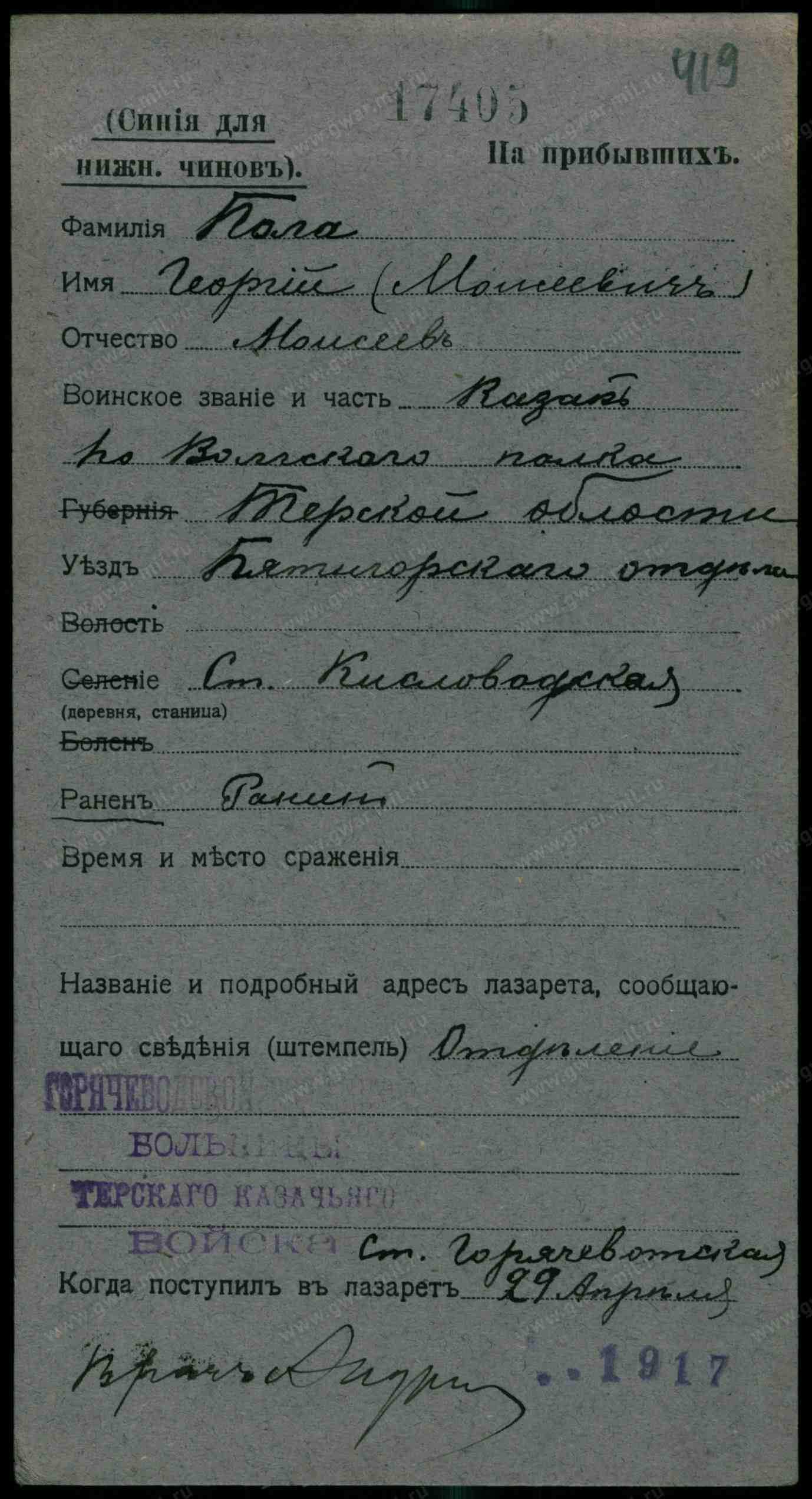 Ур. Пола Георгий Моисеевич, 5 сотня, 1-й Волгский полк, правос., женат, ст. Кисловодской Терской обл. Пятигорского отд., ранен 7.08.1916 под с. Рудка-Червище.