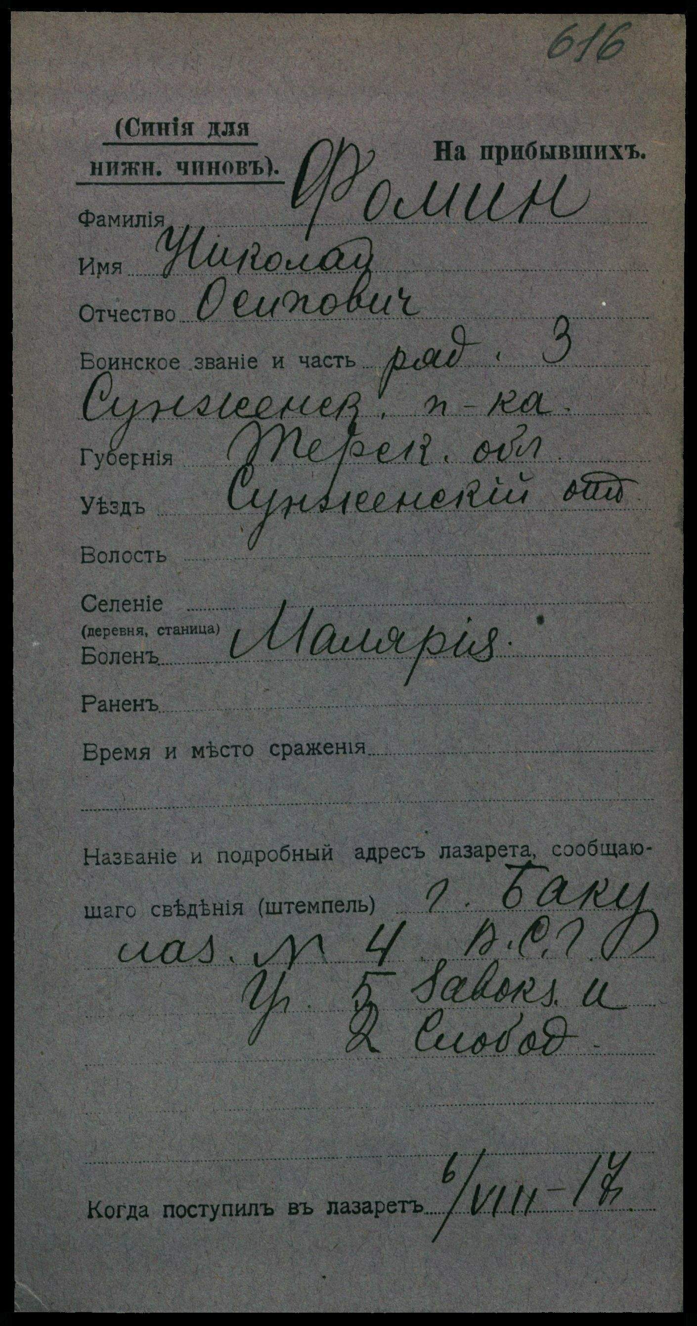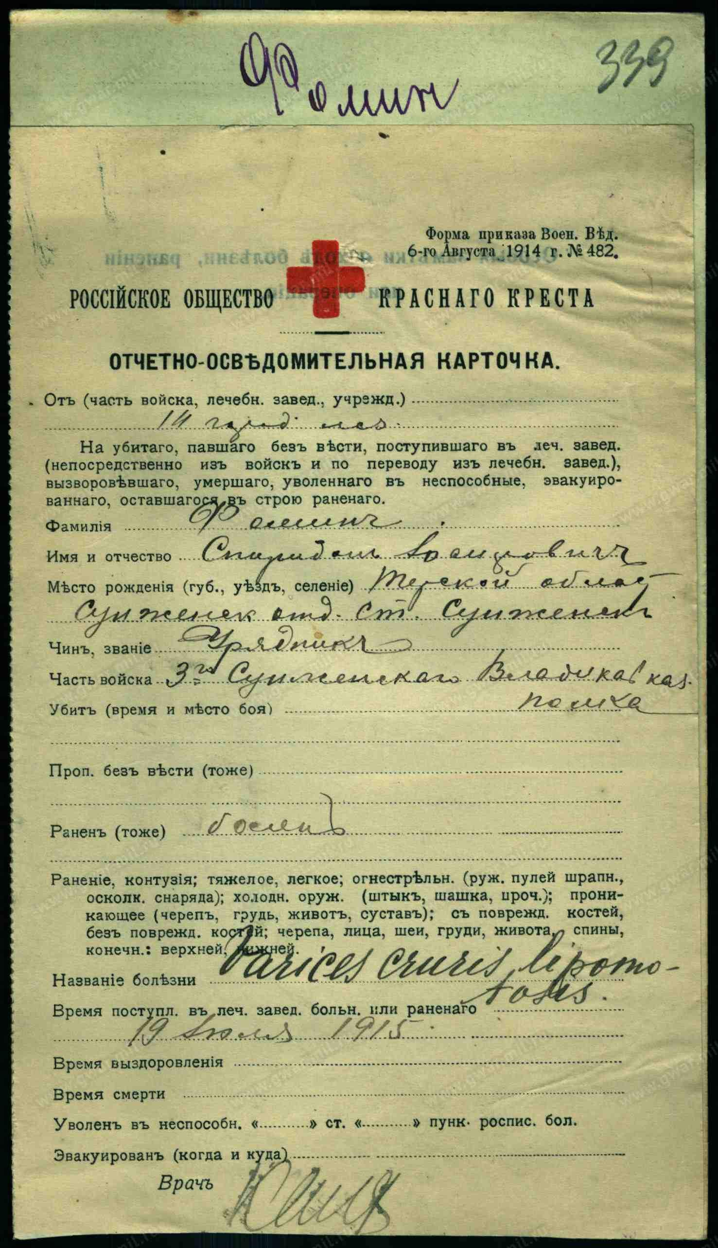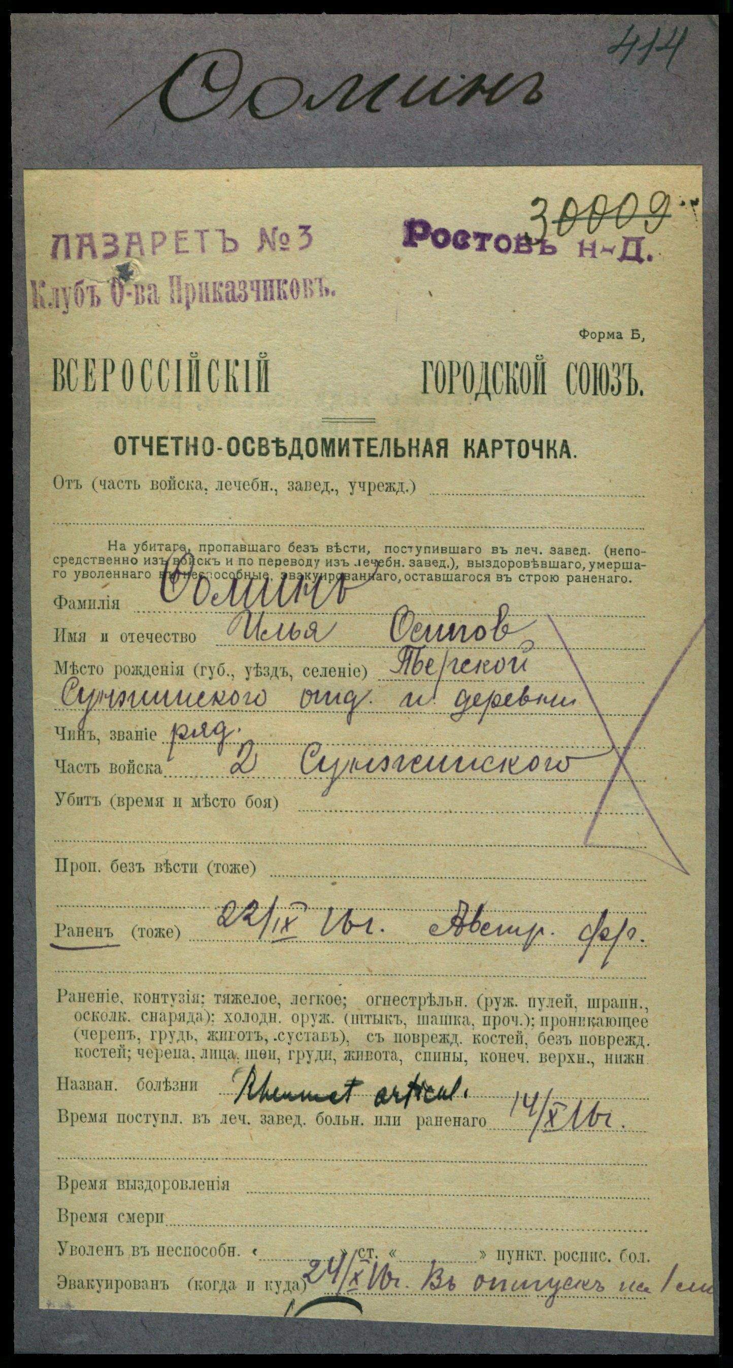 210 Фомин Иван Иосифович Сунженская Ранен/контужен, Выбыл: перевязочный отряд, Казак, 22.07.1916