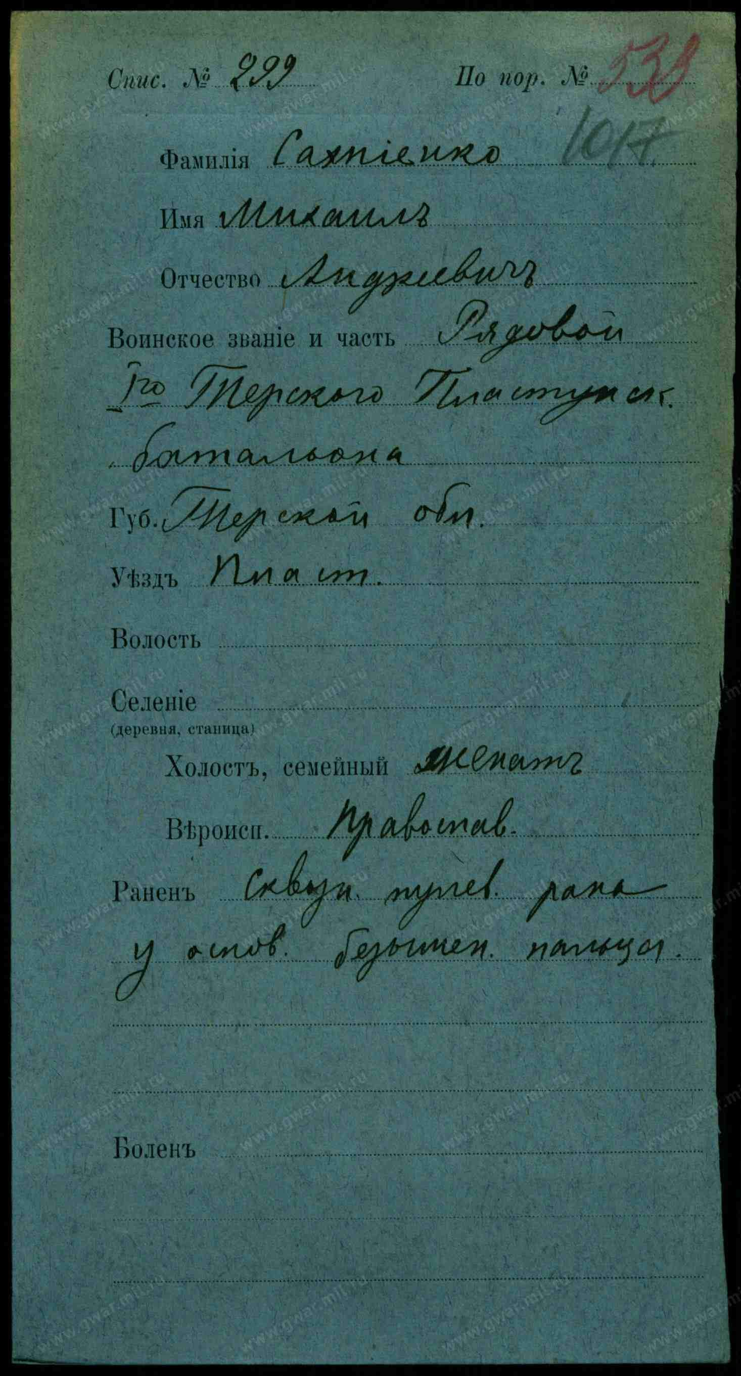 Каз. Сахненко Михаил Андреевич, 1-й Терский пеший бат., правос., вдов, ст. Зольской Пятигорского отд. Терской обл., ранен 29.06.1916, п. на Северо-Восточном отроге 2963, госпиталь.