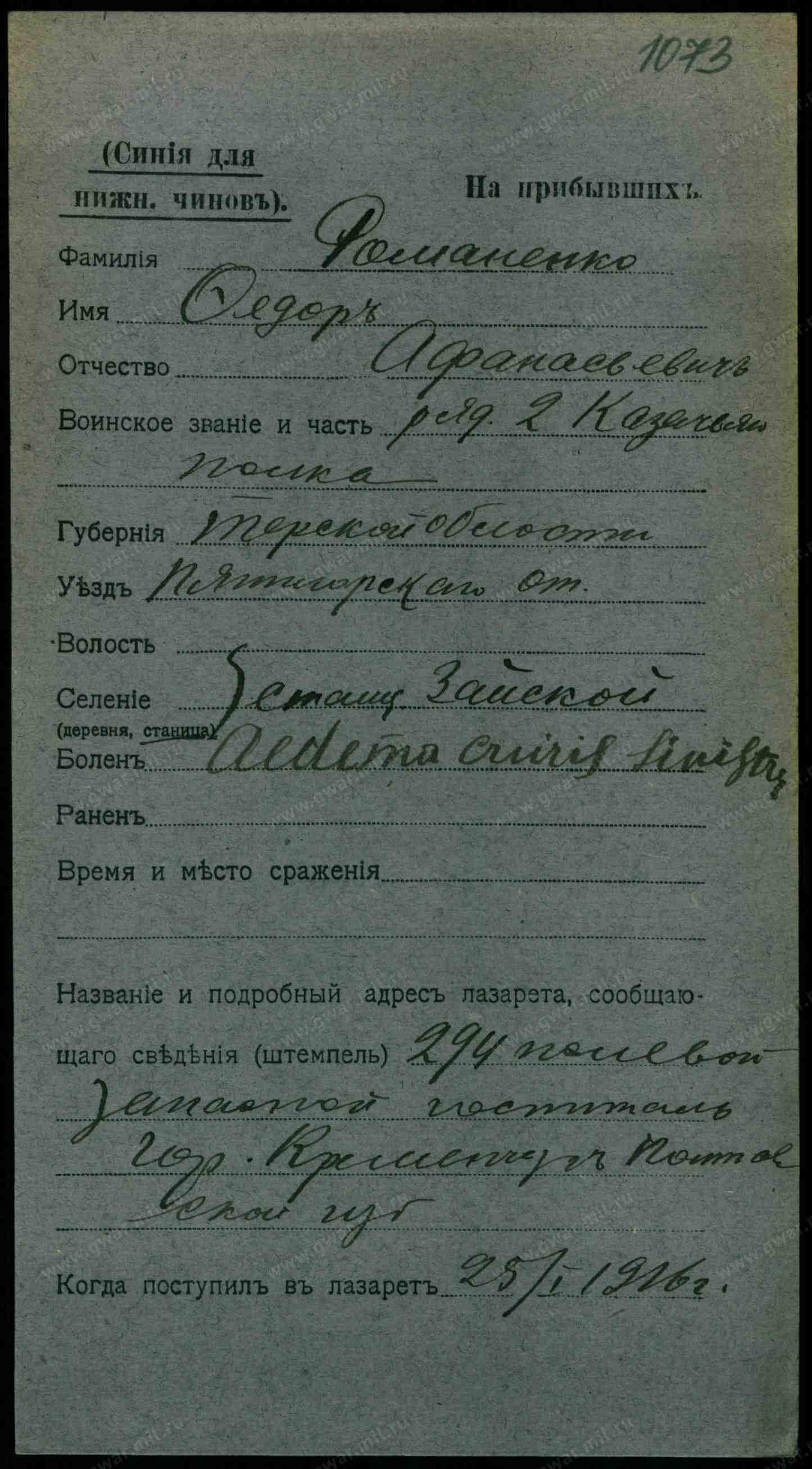 Рядовой, __.__.1901 Орджоникидзевский край, Георгиевский р-н, станица Зольская , Место службы: 299 сд 956 сп. Из госпиталя