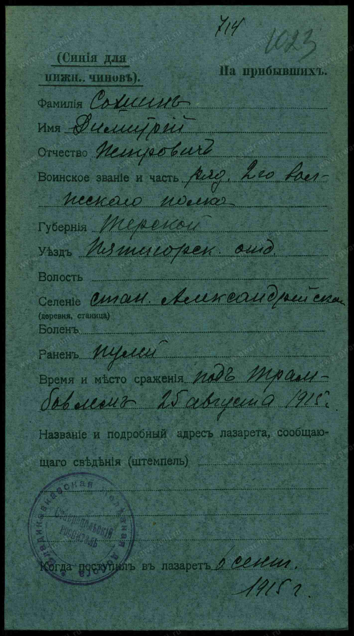 Капитан вет. службы, __.__.1909 Ставропольский край, Александрийско-Обиленский р-н, с. Александрия. Сводная картотека