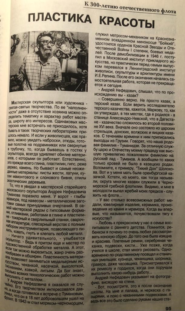 - Совершенно верно. Не просто казак, а терский казак. Если верить исследователю терского казачества, кажется, Маркову, то, как он утверждал, в тех местах, где я родился – в станице Александро-Невской, что в Дагестане, казачество сложилось во второй половине 16 века. Вначале оно состояло из царских стрельцов, донских, волжских и яицких казаков. С течением времени к ним приписались выходцы из Грузии. Говорят, что наша родовая фамилия – Туманидзе. За отличную службу царю и Отечеству моему прадеду как высшую привилегию пожаловали фамилию на русский лад – Туманов. А вообщем-то, каких только кровей не было в казацких родах. Вспомните, к примеру, «Тихий Дон» Шолохова. Вот и у меня мать была оренбургской казачкой. Кстати, из моего, как тогда называли, округа многие казаки служили в Черноморской гребной флотилии. Видимо, и мне в молодости выпал жребий моих предков – служить на флоте…>