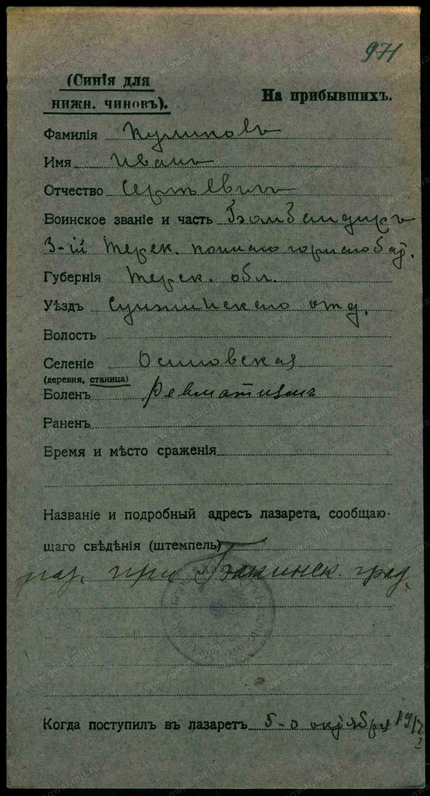 Тип документа Карточка на прибывших (нижние чины)