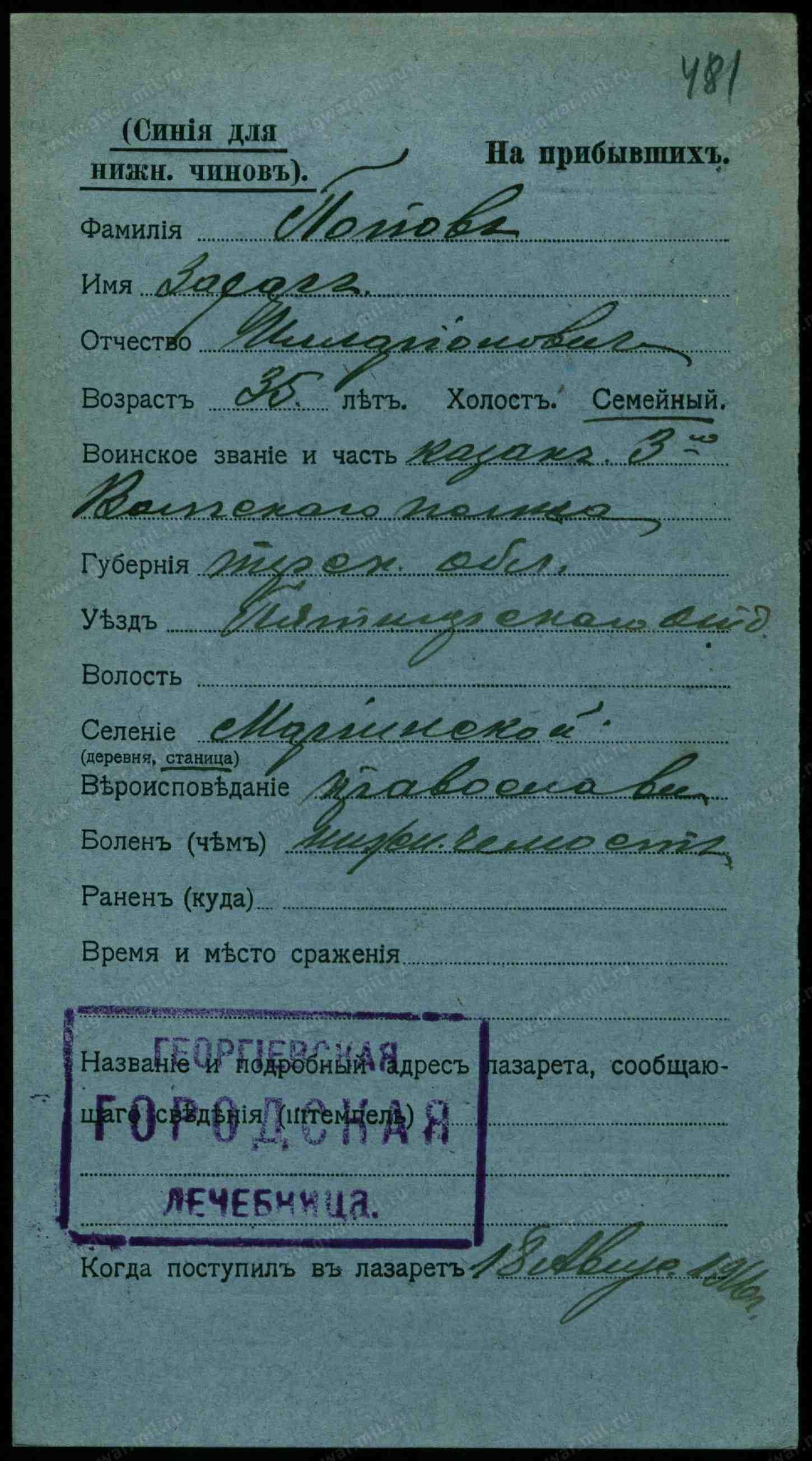 Майор. __.__.1916 Ставропольский край, Марьинская. Сводная картотека