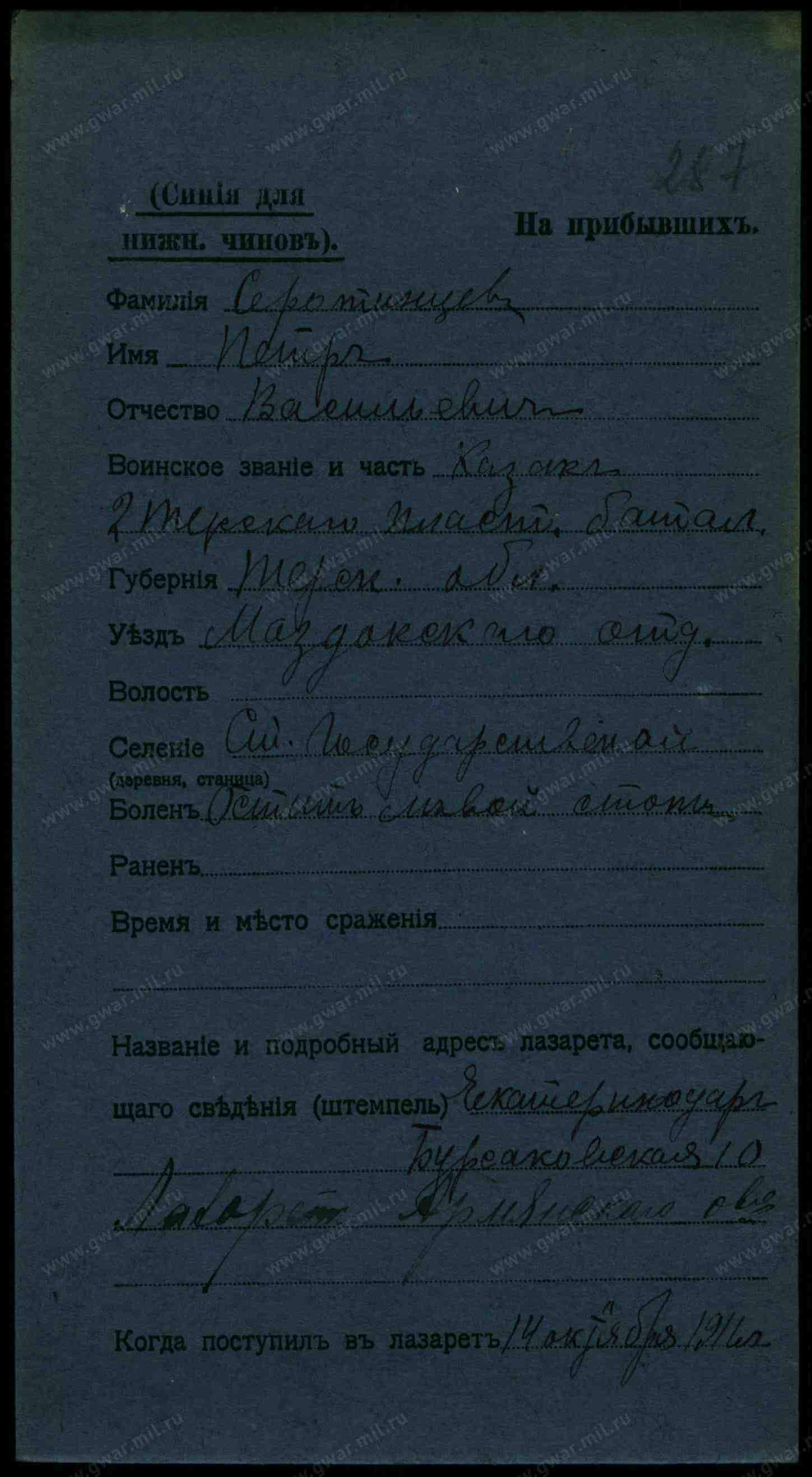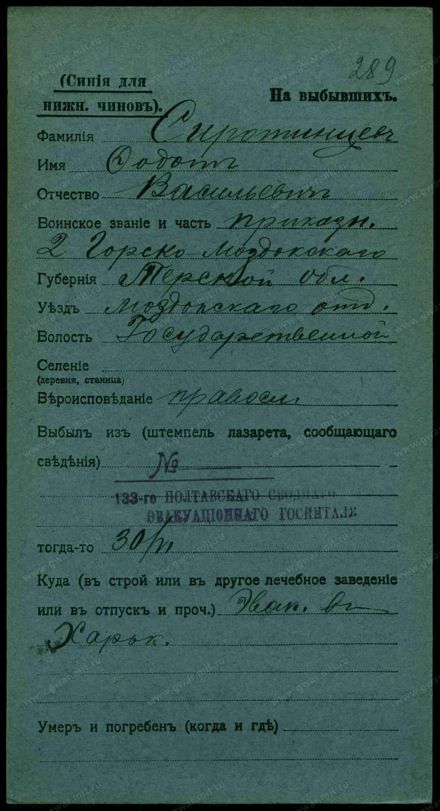 Место выбытия сел. Цицилово; 192 полевой госпиталь г. Станислав