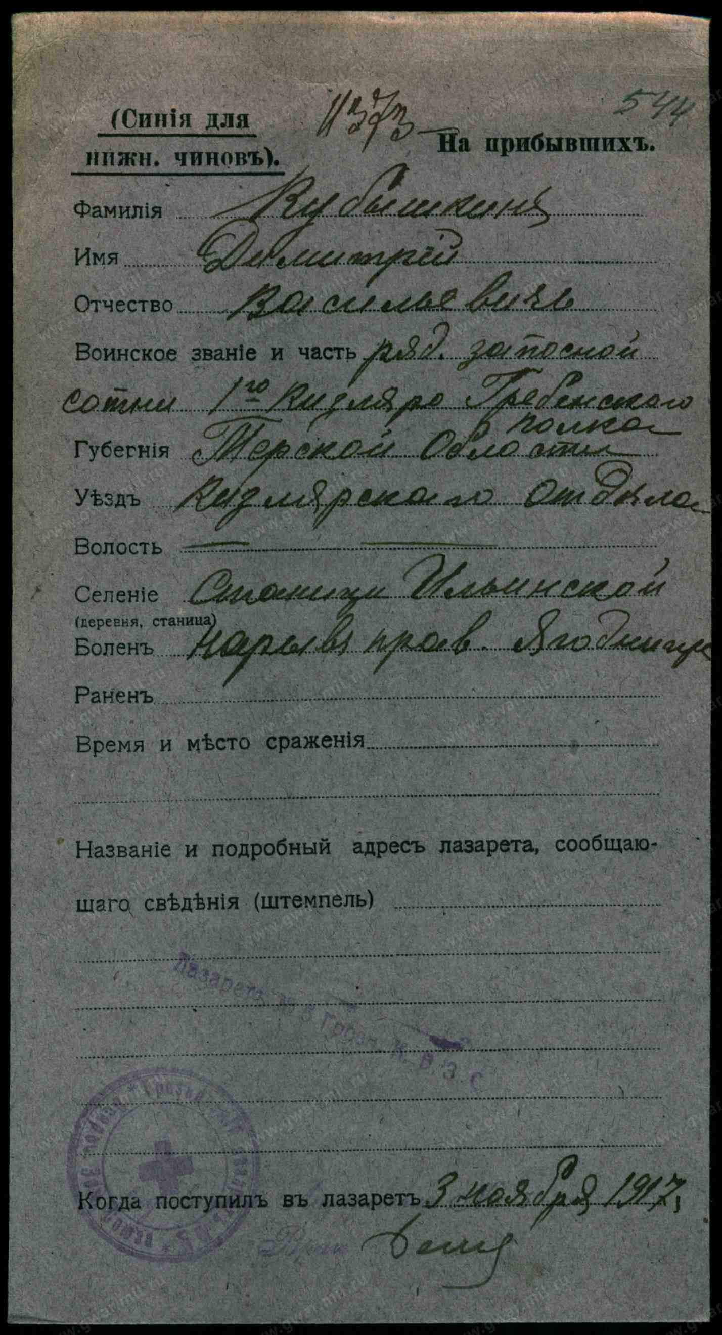 1. Кубышкин Василий Романов, хозяин, 33 года, казак, родился здесь, правосл., родной язык русский, неграмотный, земледелец, Терский льготный казак.
