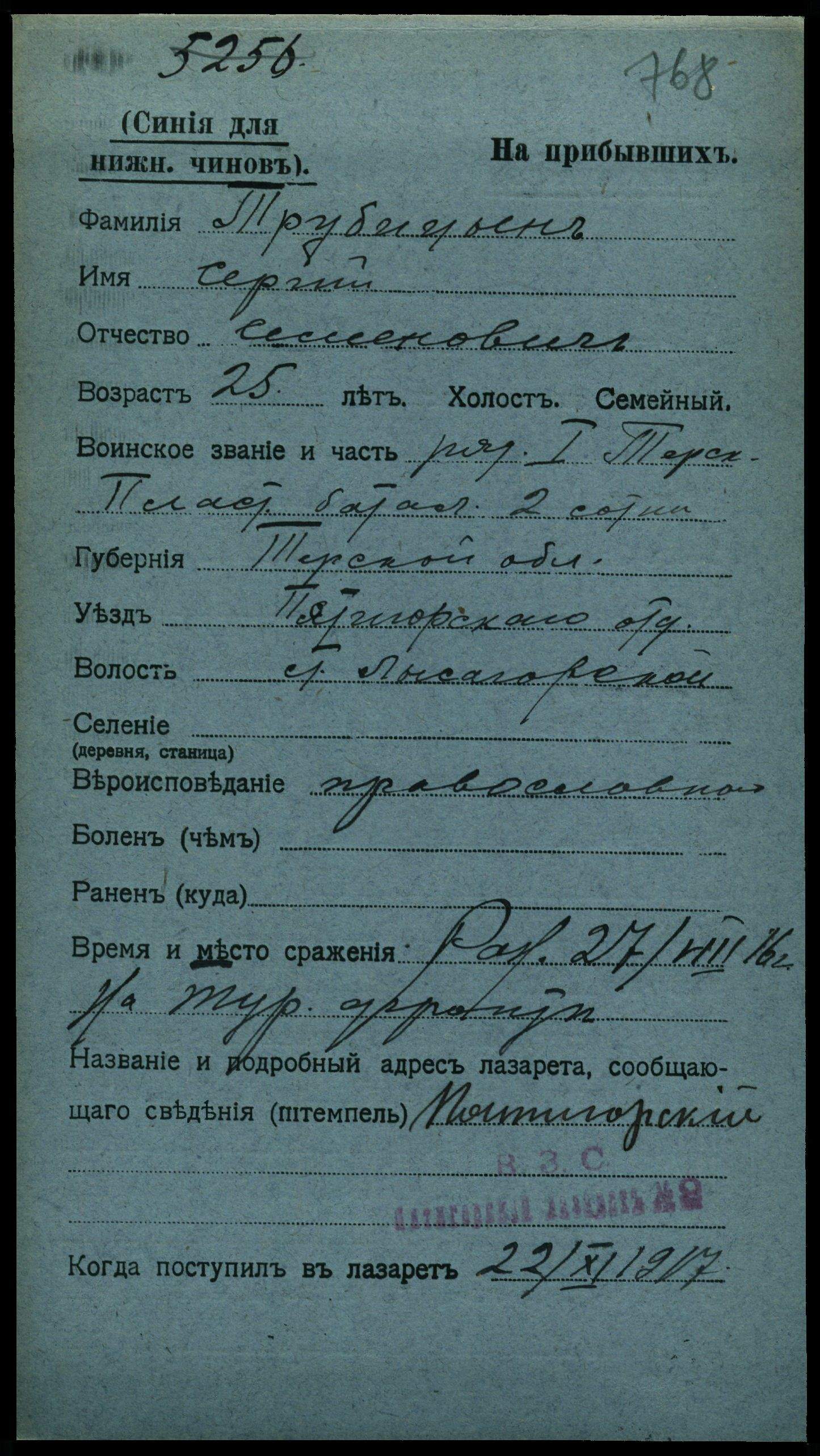 Тип документа Карточка на прибывших (нижние чины)