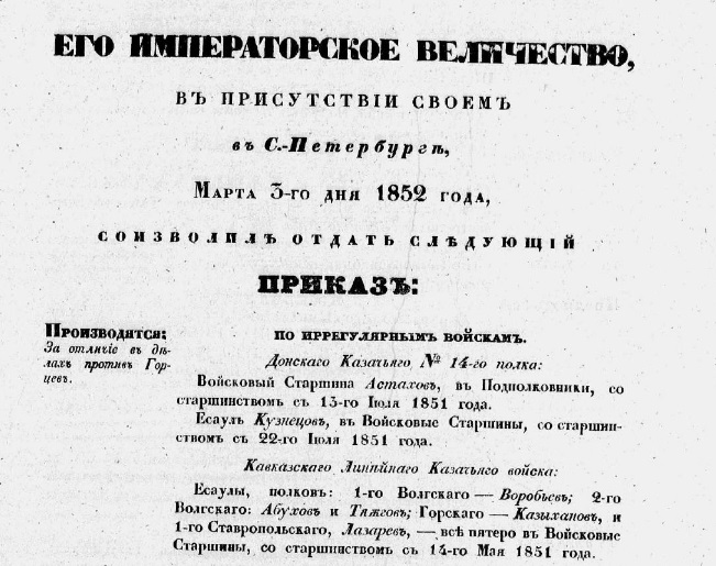 Есаулы полков: 1-го Волгского - ВОРОБЬЕВ; 2-го Волгского - АБУХОВ и ТЯЖГОВ; Горского - КАЗЫХАНОВ; 1-го Ставропольского -ЛАЗАРЕВ - все пятеро в Войсковые старшины, со старшинством с 15 мая 1851 г.