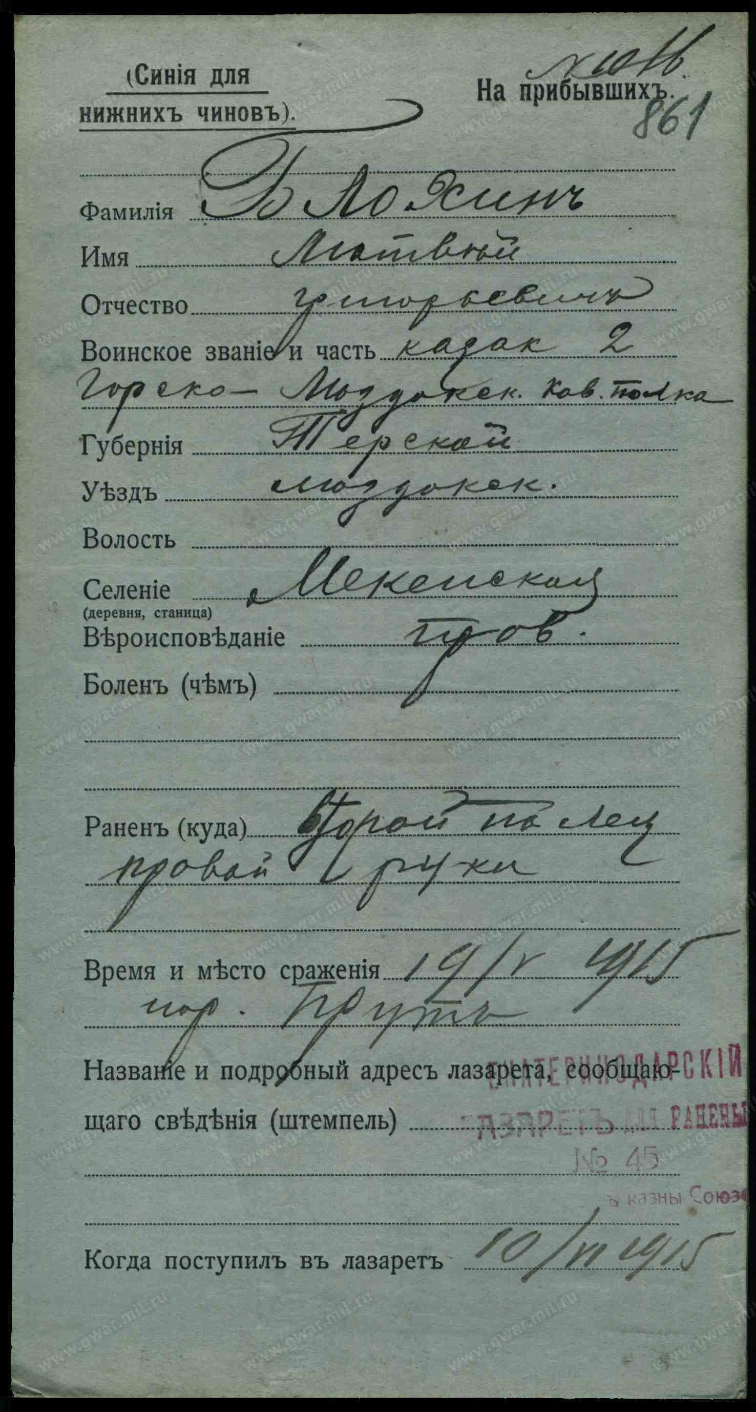Место лечения: Херсонская губ., н.п.Куяльницкий Лиман