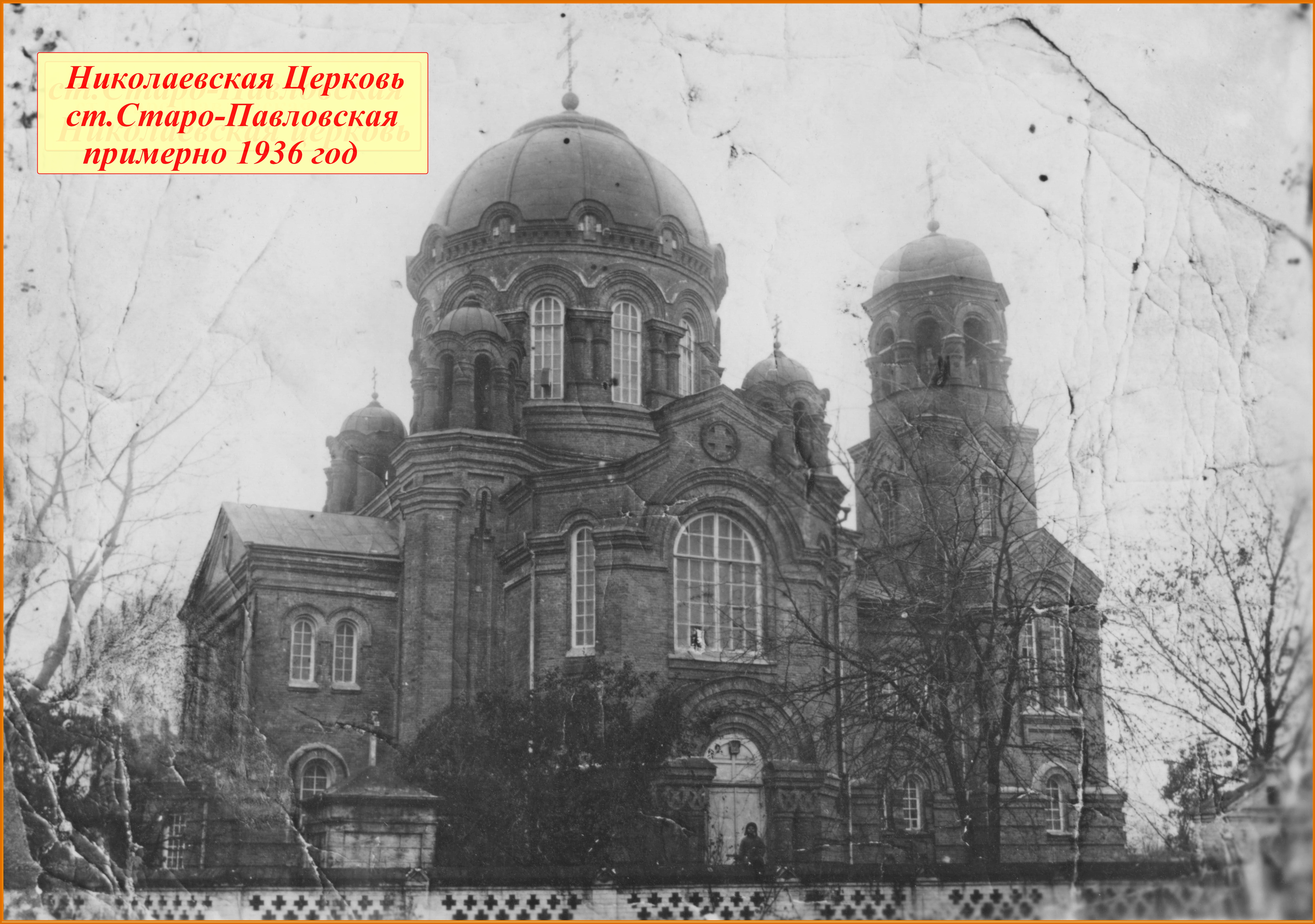 Николаевская Церковь ст.Старо-Павловская - фото примерно 1936 -1938 года, была затем разрушена до основания ,а все церковные книги -были сожжены.
