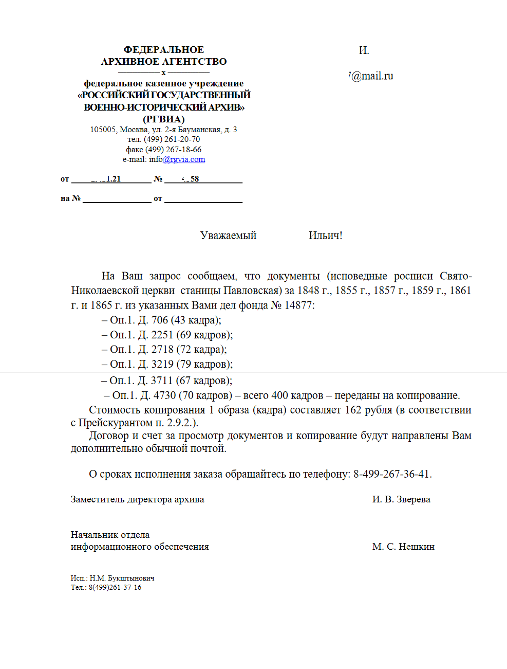 В 2021 году обращался с запросом Госархив РГВИА г. Москва ,а 29 ноября 2021 года получил ответ на мой запрос по сведениям о Волгских (Донских) казаках ст. Павловской, ныне это ст. Старо-Павловская Кировский ГО СК. Архив подтверждает, что в архиве фонд №14877 - имеются Исповедные росписи Свято-Николаевской церкви ст. Павловской с 1848 по 1865 годы.