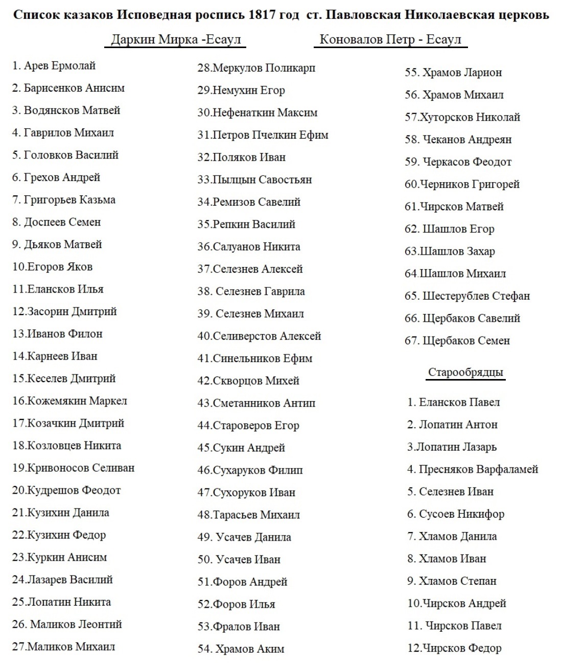 Список Волгских (Донских) казаков ст. Павловской (ныне ст.Старо-Павловская) из Исповедной росписи Свято-Николаевской церкви за 1817 год