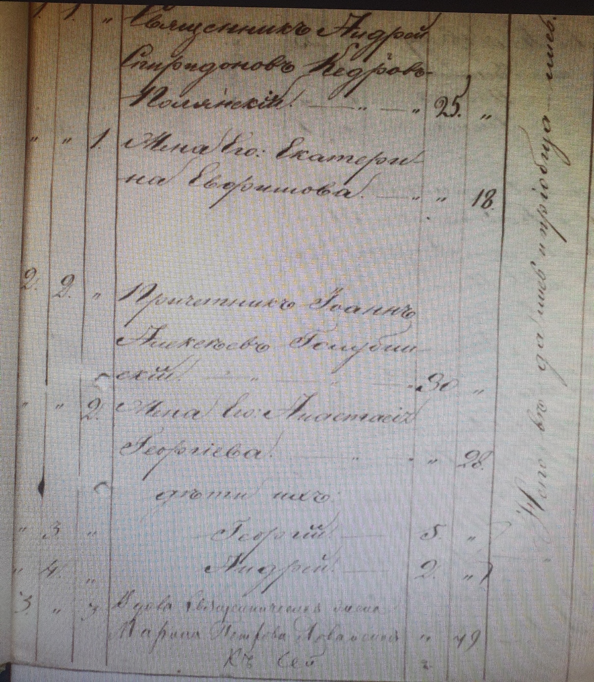 1. Никифор Андреев Шаповалов 41, Жена его Анна Андреевна 38,дети их:Евдокия 16, Наталья 14, Евдокия 11, Александр 9,Антон 1\2