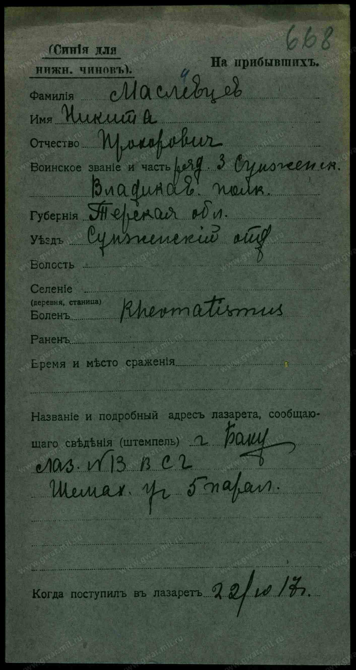 Казак Маслевцов Алексей Егорович (Георгиевич), православный, 3-й Сунженско-Владикавказский полк, ст. Михайловская Сунженского отд. Терской обл., выбыл из Михайловской стан. Больницы 11 октября 1916 г. в Управление Сунженского отд.