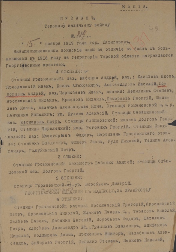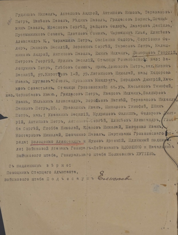 ст. Грозненской: каз.: Ярославский Григорий, Ярославский Петр, Ярославский Николай, Жданов Павел Ф., Тарасов Николай, Халеев Павел, Бабенко Евгений, Воробьев Федор, Шаталов Петр, Елисеев Александр Еф., Гудимов Владимир, Епифанов Николай, Болдырев Аким, Прокопов Виктор, Балабанов Александр, Зибиров Георгий, Лепилко Степан, Панков Николай, Гудимов Михаил, Астапов Андрей, Антипов Никон, Тараконов Петр, Макеев Павел, Редин Павел, Гридасов Борис, Починкин Павел, Краснов Сергей, Зайцев Федор, Лазарев Даниил, Пустынников Семен, Плетнев Семен, Черкашин Илья, Елисеев Александр М., Черкашин Петр, Овсиенко Федор, Сергиенко Федор, Паннов Василий, Воронин Сергей, Тарасов Петр, Калашников Андрей, Антипов Павел, Енин Михаил, Поморцев Георгий, Петров Георгий, Ирхин Василий;