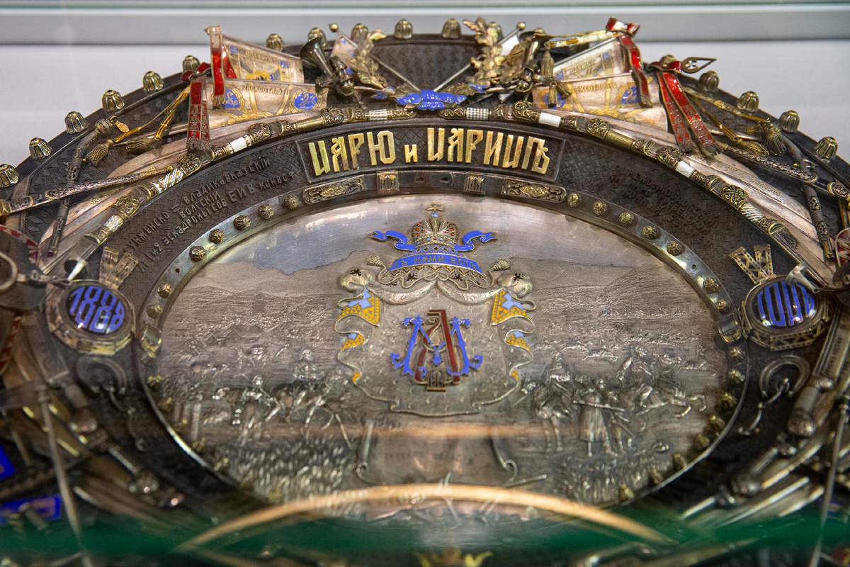 18 сент. 1888, в первый день пребывания императорской семьи во Владикавказе, Терское войско, на плошади, перед входом Их Величеств в покои, поднесло хлеб-соль. Хлеб был на блюде из черного дерева, выложенного серебром, необыкновенно изящном и оригинальном. На дне блюда — Императорский вензель, под ним карта области, а по сторонам, в медальонах, эпизоды из боевой и бытовой жизни казаков; по борту блюда, с ободком из обнаженных сабель, рельефом изображены все принадлежности казачьего вооружения, в настоящих миниатюрных моделях. Солонка к блюду изображает папаху. Государыне Императрице было поднесено серебрянное изображение линейного казака, в виде пресс-папье; Наследнику Цесаревичу — все полное вооружение: шашка, кинжал и проч.; Великому князю Георгию Александровичу — серебряный альбом, с фотографическими видами казачьих станиц и сцен из казачьей жизни.