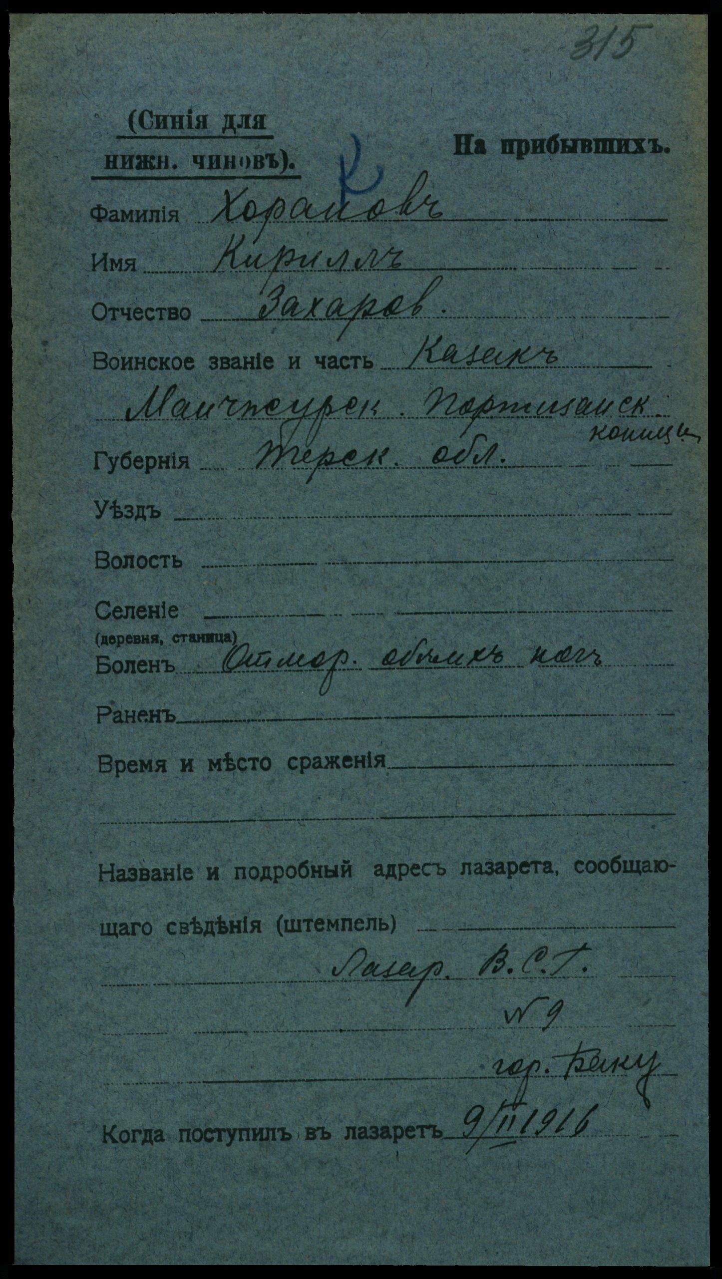 Тип документа Карточка на прибывших (нижние чины)