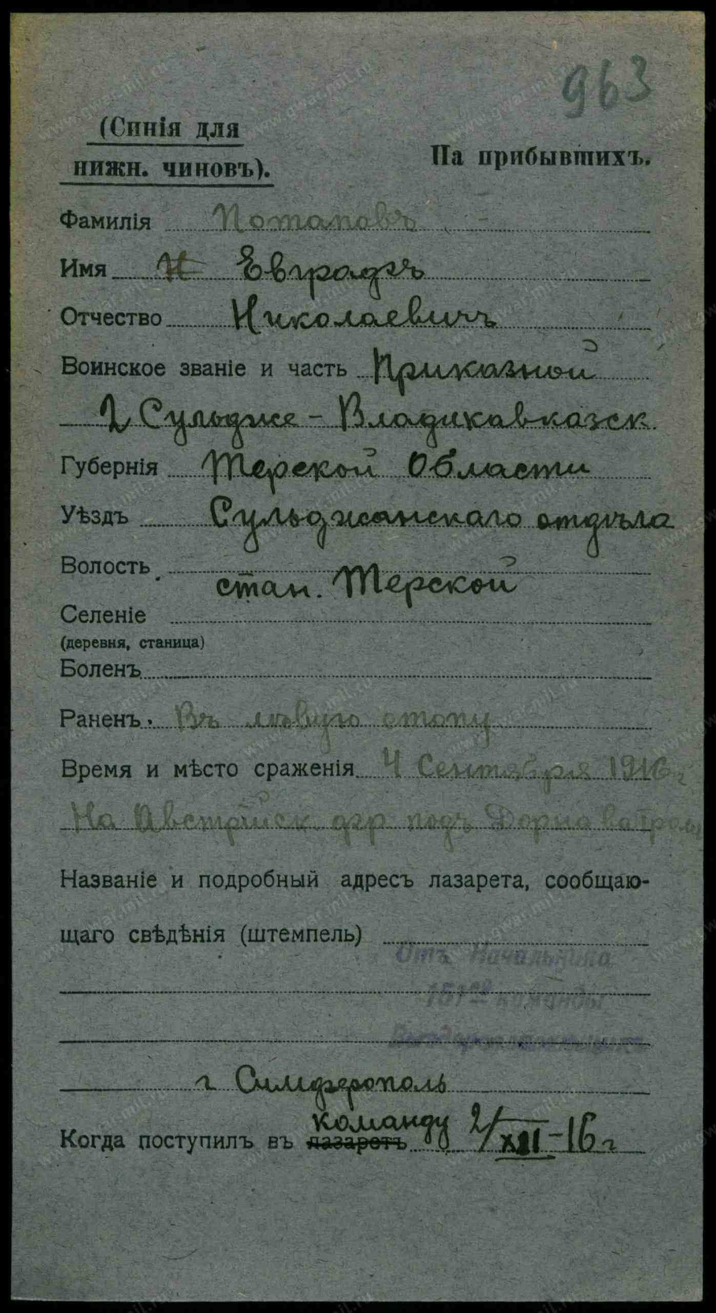Ефрейтор __.__.1917 Орджоникидзевский край, г. Мордок, ст. Терская , Место службы: 24 тбр. Донесение о потерях