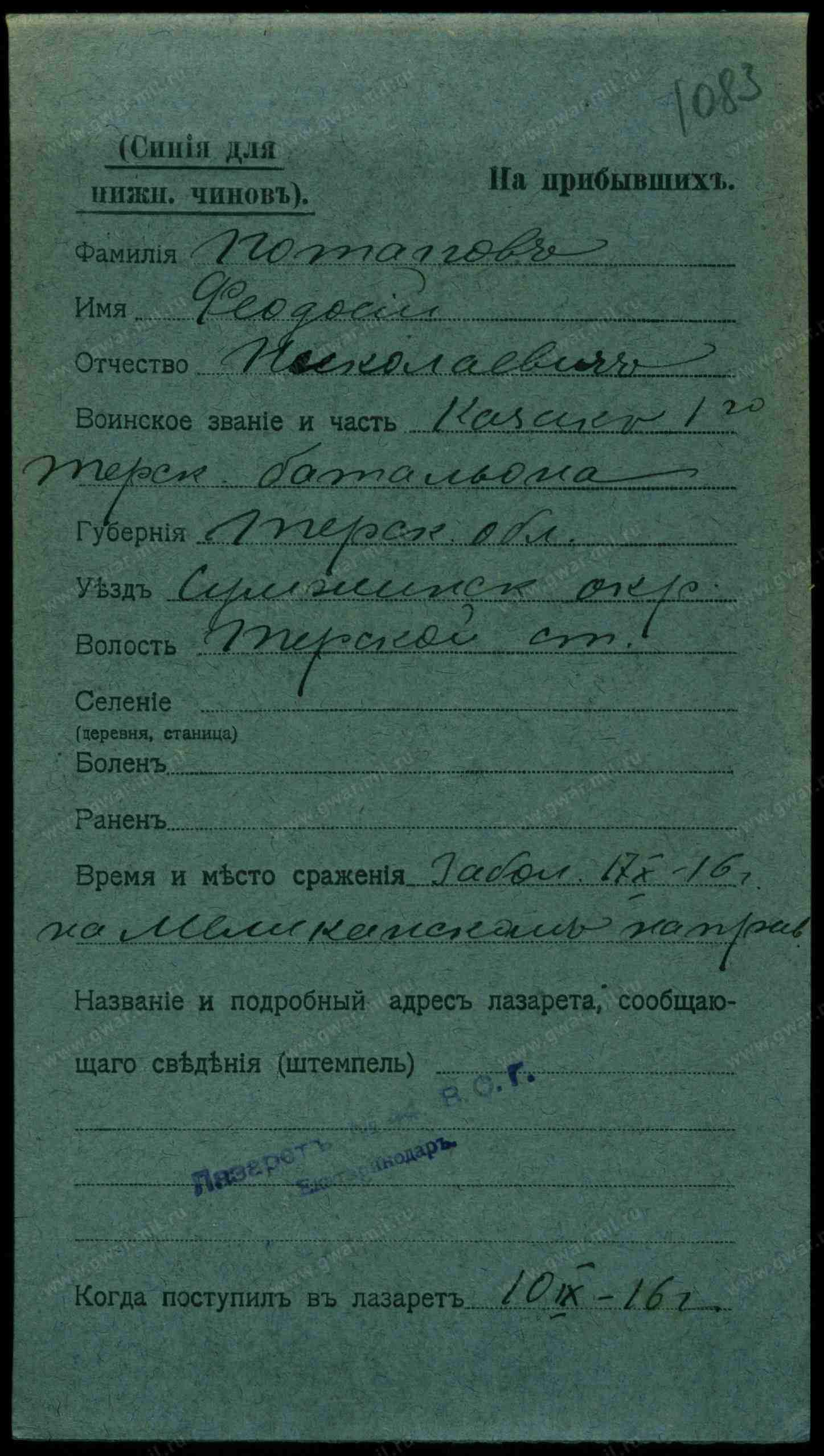 Ищу материалы и информацию по Потапову Николаю Алексеевичу, ст. Терская,казак, его служба в 1-м Сунженско-Владикавказком полку 1914-1917гг, данные об его отце Алексее, его братьях, данные о семье, другая полезная информация