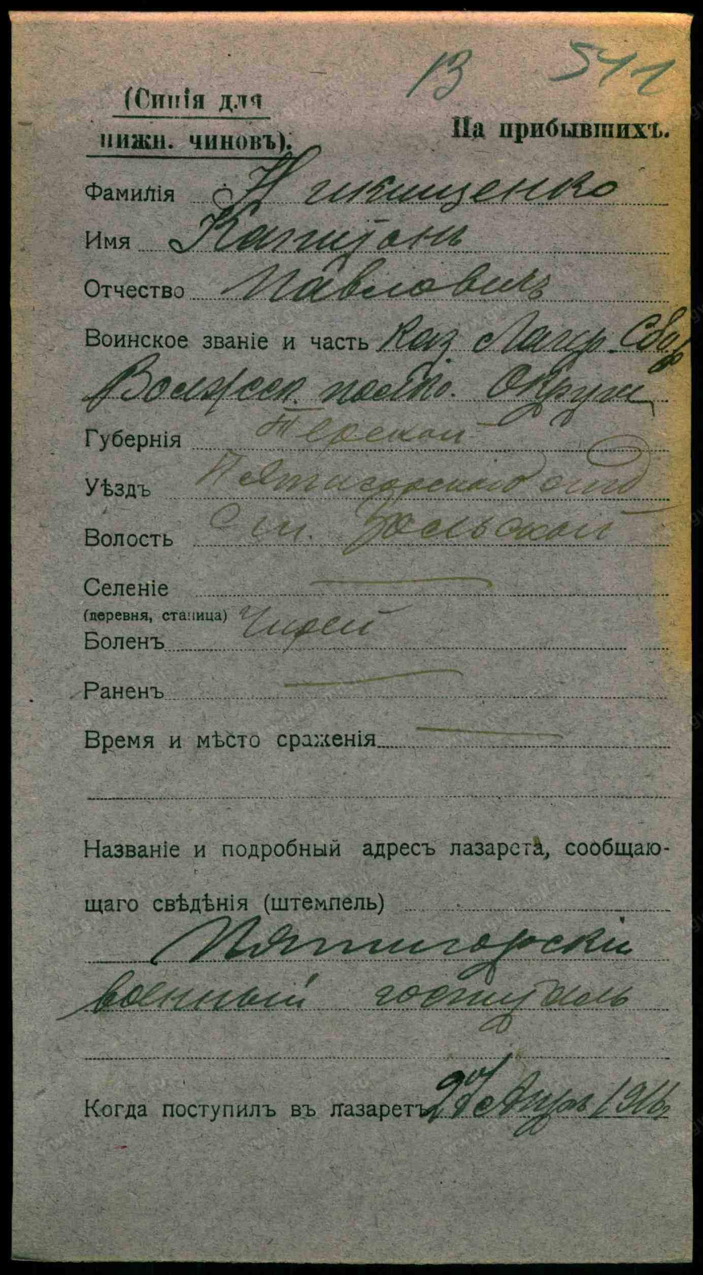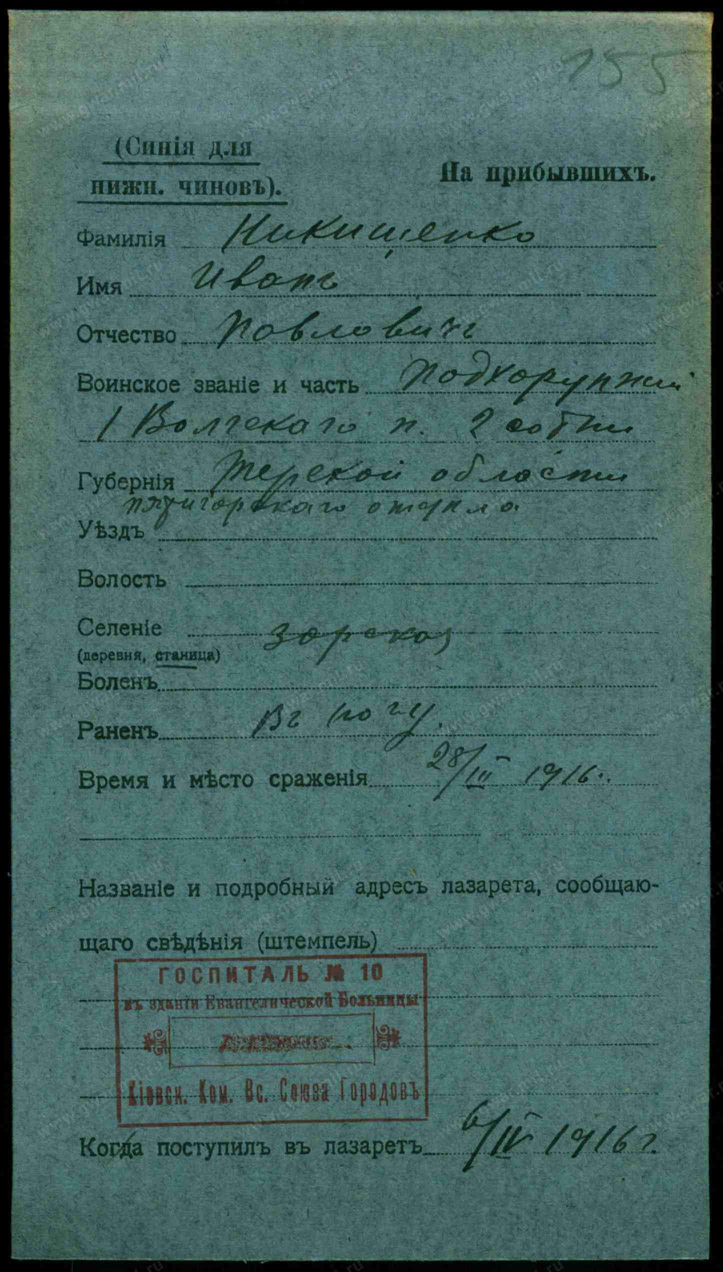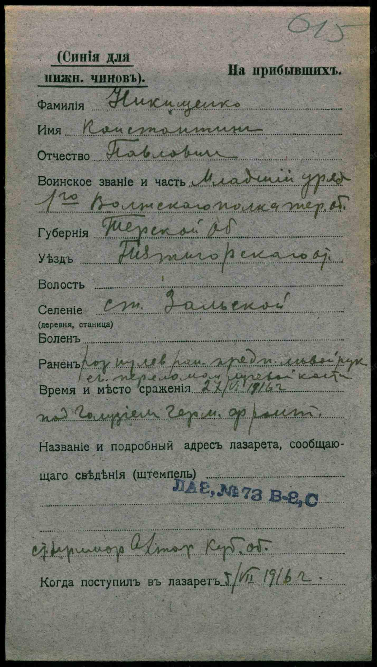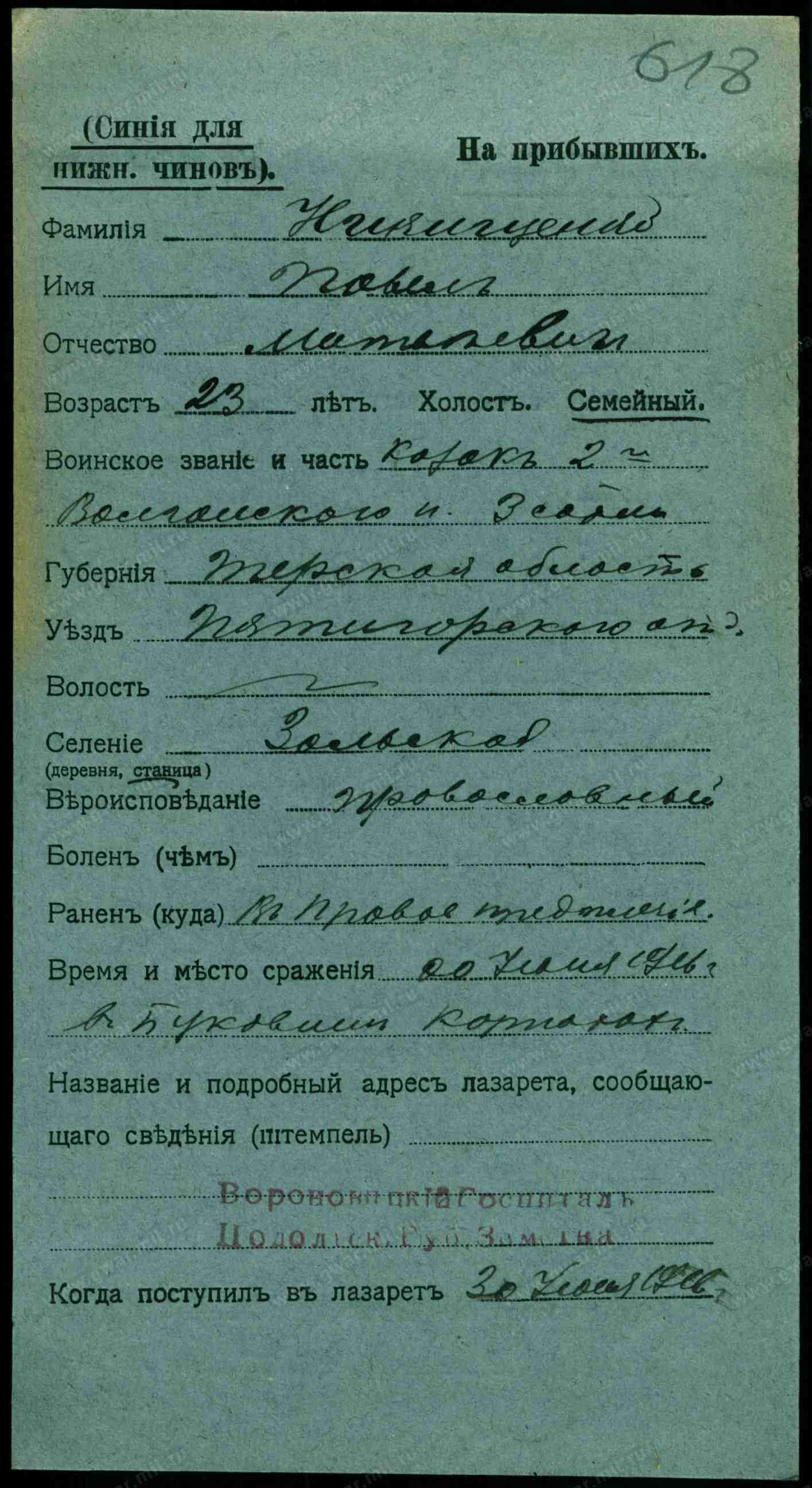 Ст. ур. Никищенко Иван Павлович, 2 сотня, 1-й Волгский каз. полк, правос., жен., ст. Зольская Пятигорский отд. Терская обл. контужен 29.08.1914 под с. Пустомиты.