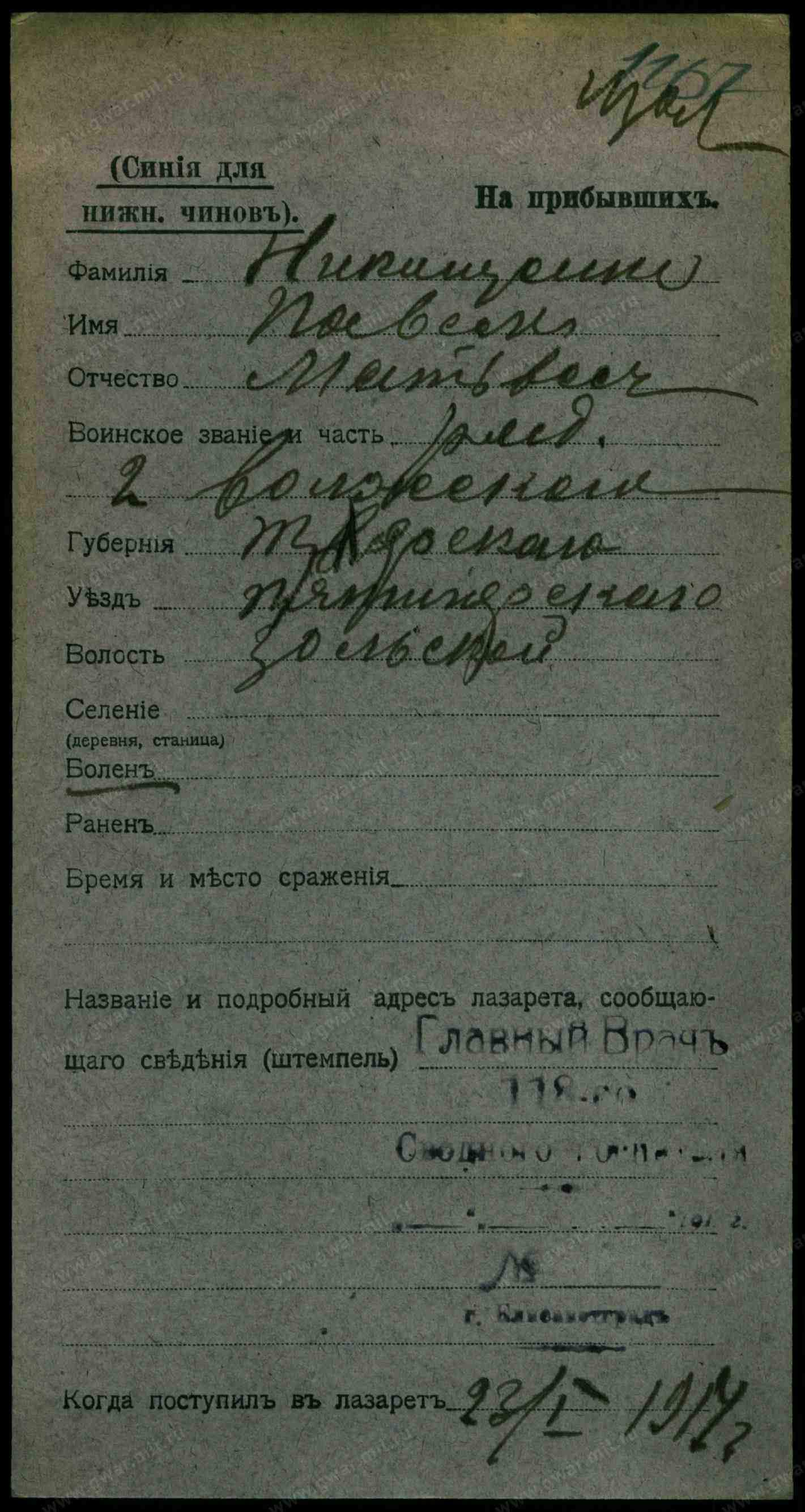 НИКИЩЕНКО Иван Павлович — 1 Волгский каз. Его Императорского Высочества Наследника Цесаревича полк, вахмистр. За отличие в бою 11.12.1914 под д. Ветржно.