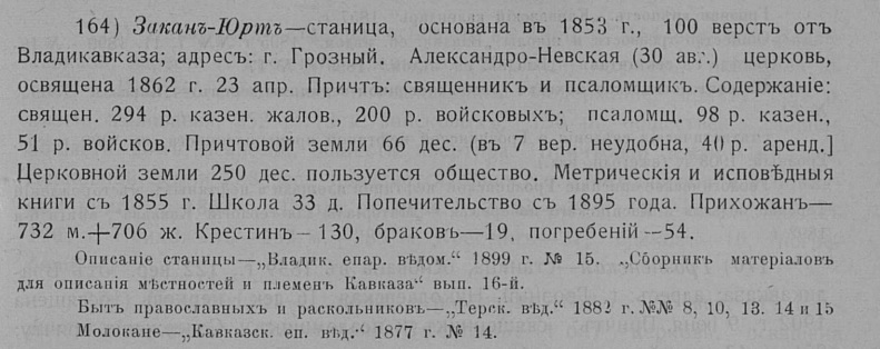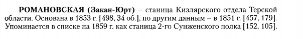 ст. Закан-Юртовская (Романовская), основана в 1853г. На январь 1911г. 420 казачьих дворов, всего 3447 жителей (из них казаков 3206).