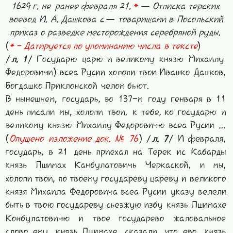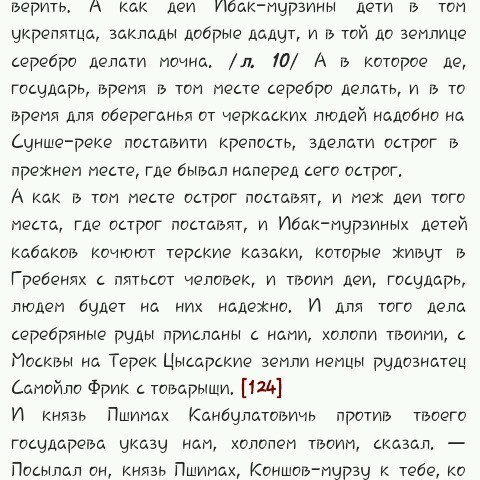 В прошлом, государь, во 151-м году ехали ис Кабарды в твою государеву отчину в Терской город дворовые наши людишка и задворные узденишка с 30 человек з женами и з детьми и з запасишком нашим. И как, государь, будут оне на Сунше-реке против Холопья городища, гребенских городков с Чернова и з Белой и з Гремячей атаманы Андрей, да Пимин, да Олтух со всеми своими станицами, да терскова, государь, казачья атамана Курдюковы станицы казаки Байтерек да Евлаш с товарищи по наученью казачья ж атамана Федора Шевеля тех людишек наших побили, а иных з женами и з детьми в полон поимали. Да на том же, государь, погроме взяли 100 быков да 60 телег запасу. И мы, холопи твои, о том погроме били челом тебе, государю, а на Терке твоим государевым воеводам Михаилу Петровичю Волынскому с товарищи в съезжей избе подали челобитную, чтоб он про то велел сыскать, а по сыску указ учинить. И твои государевы воеводы Михаила Петрович Волынской с товарищи сыску и указу нам о том не учинили, потому что с тех воровских атаманов и казаков побрали оне посулы большие да мамку нашу з дочерью.