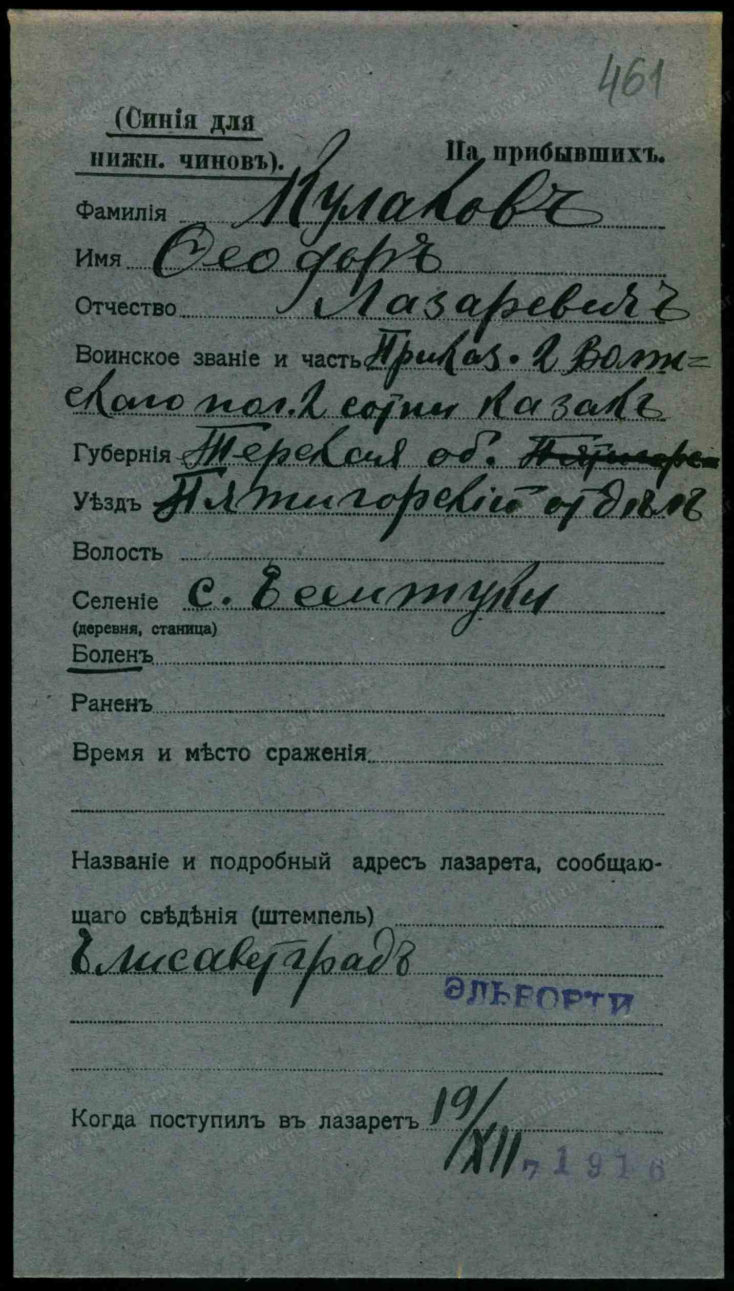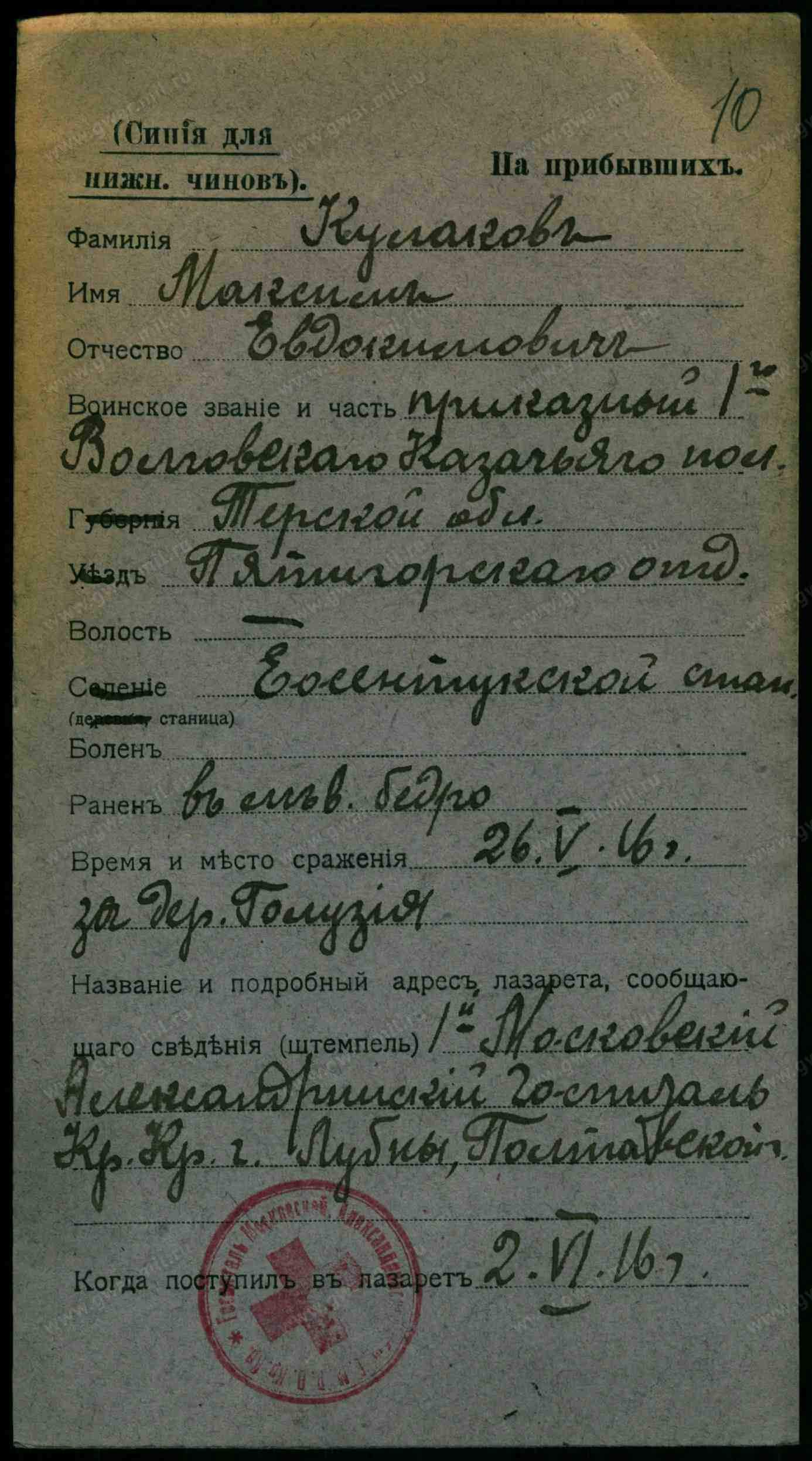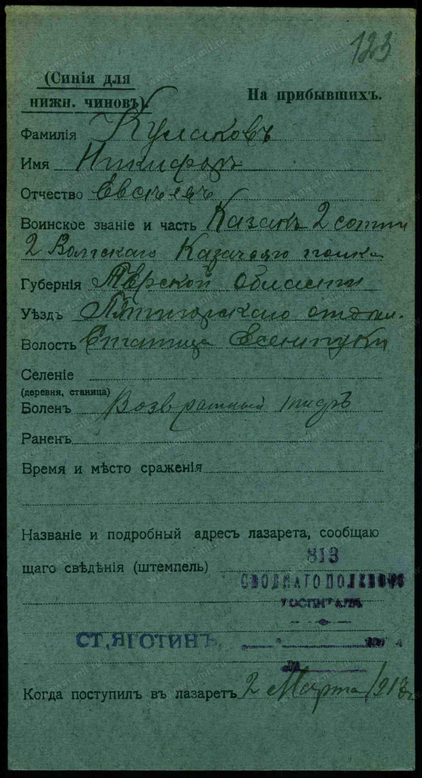 Родился 8 августа 1880 г. в станице Ессентукской Терского Казачьего Войска. Из семьи урядника. Получил домашнее образование. 14 марта 1900 г. зачислен на первоочередную службу в 1-й Волгский полк. 17 января 1904 г. произведен в чин младшего урядника, 19 декабря 1904 г. — в чин старшего урядника. 14 января 1906 г. по собственному желанию остался на сверхсрочную службу в родном полку. С 19 сентября 1906 г. по 14 июля 1907 г. обучался в школе подхорунжих. 18 июля произведен в вахмистры, а 20 декабря — в подхорунжие. 14 апреля 1912 г. награжден серебряной медалью «За усердие» на Станиславской ленте, затем уволен в запас. 30 июля 1914 г. призван по мобилизации в 1-й Волгский полк. Приказом по 2-й Сводной кавалерийской дивизии произведен в чин зауряд-хорунжего 25 сентября. 1 октября в бою на перевале Ужок (Карпаты) ранен. 23 октября возвратился в полк. В конной атаке 24 декабря контужен, но остался в строю. Приказом Главнокомандующего Юго-Западным фронтом № 122 от 10 февраля 1915 г. произведен в чин прапорщика. Вследствие ранений с 3 июня 1916 г. по 15 февраля 1917 г. — командир обоза полка. Высочайшим приказом 28 июля 1916 г. произведен в хорунжие. 3 марта 1917 г. назначен временным командиром 3-й сотни полка, которой командовал до 22 апреля. С 11 по 28 мая — временный командир 5-й сотни. 6 июля приказом по Армии и Флоту произведен в чин сотника. Находился в составе полка на фронте до 21 декабря, После официальной демобилизации 21 марта 1918 г. убыл в родную станицу.