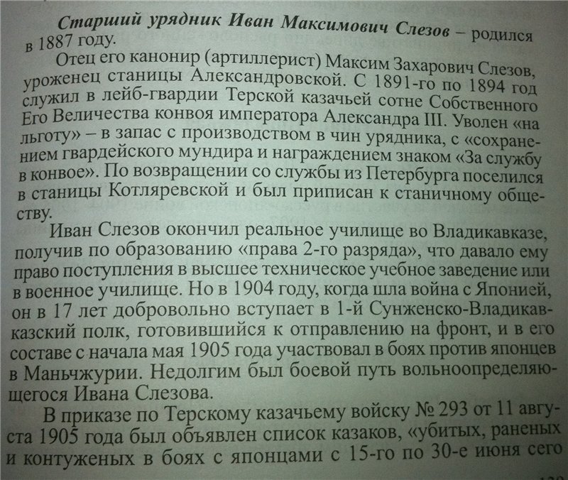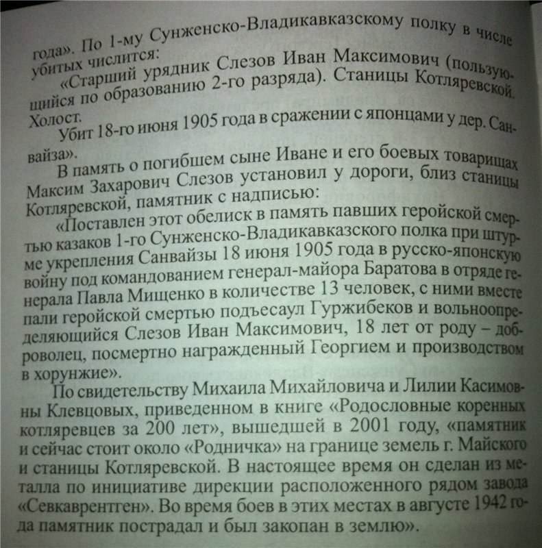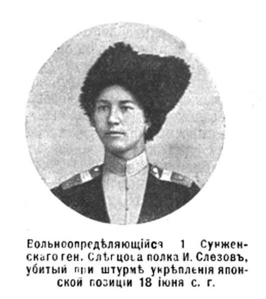 В приказе по Терскому казачьему войску от 11 августа 1905г. в списке казаков 1-го Сунженско-Владикавказского полка, убитых в боях с японцами на Дальнем Востоке указан: " Старший урядник Слезов Иван Максимович, казак станицы Котляревской, холост. Убит 18 июня 1905г. в сражении у деревни Санвайза (Сан-Вай-Цзы). Посмертно награждён знаком отличия Военного ордена и произведён в хорунжии".