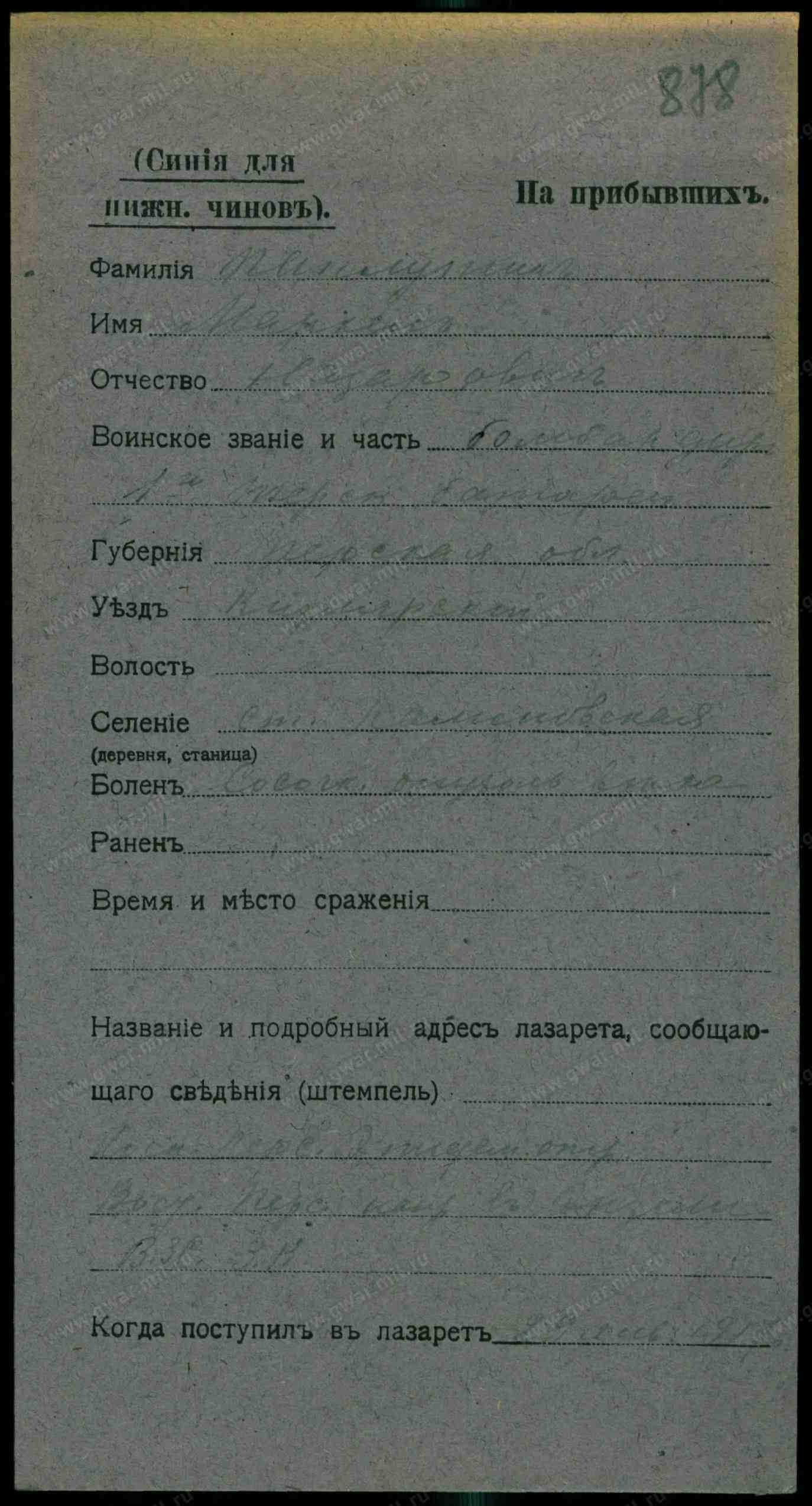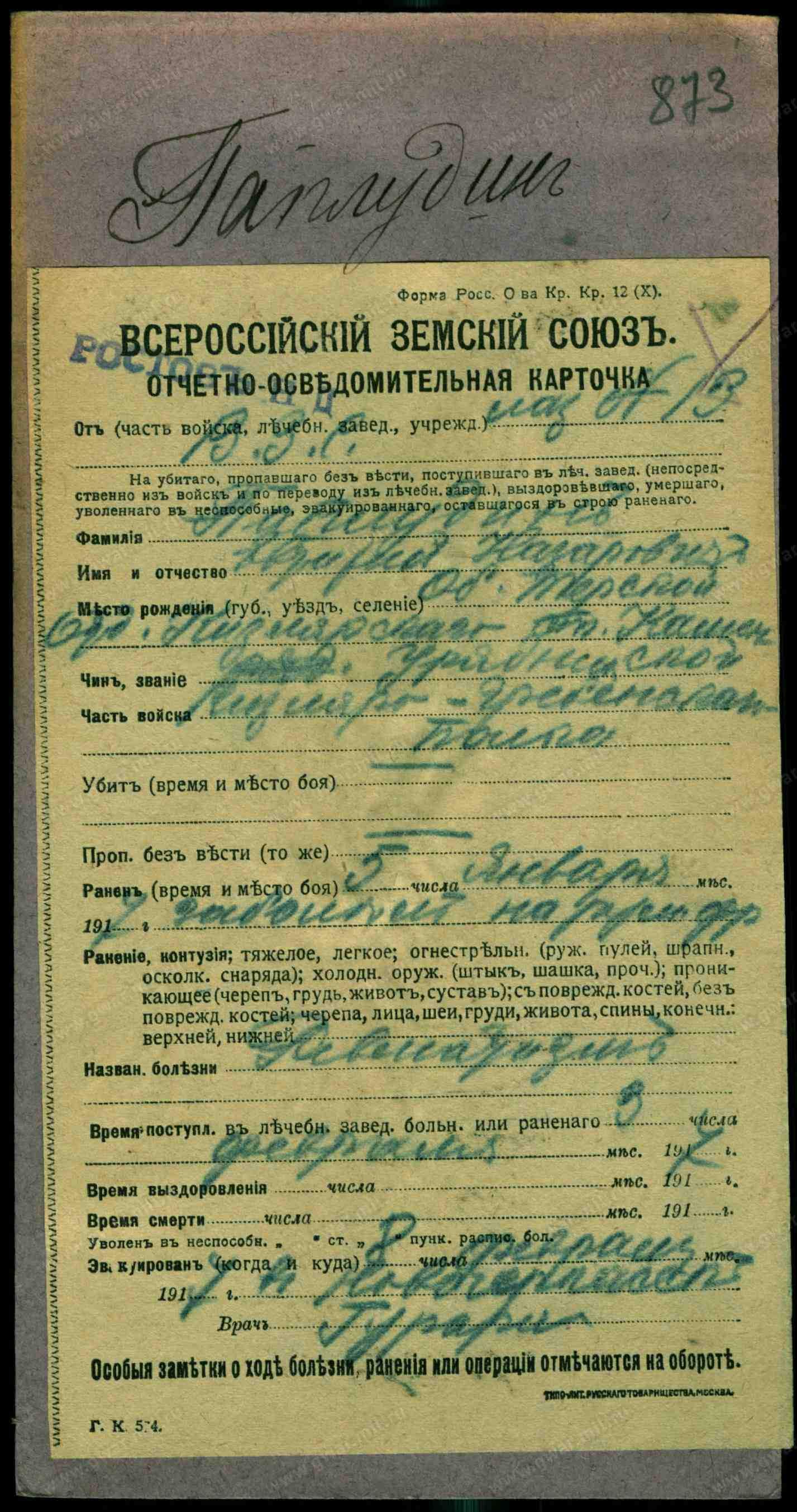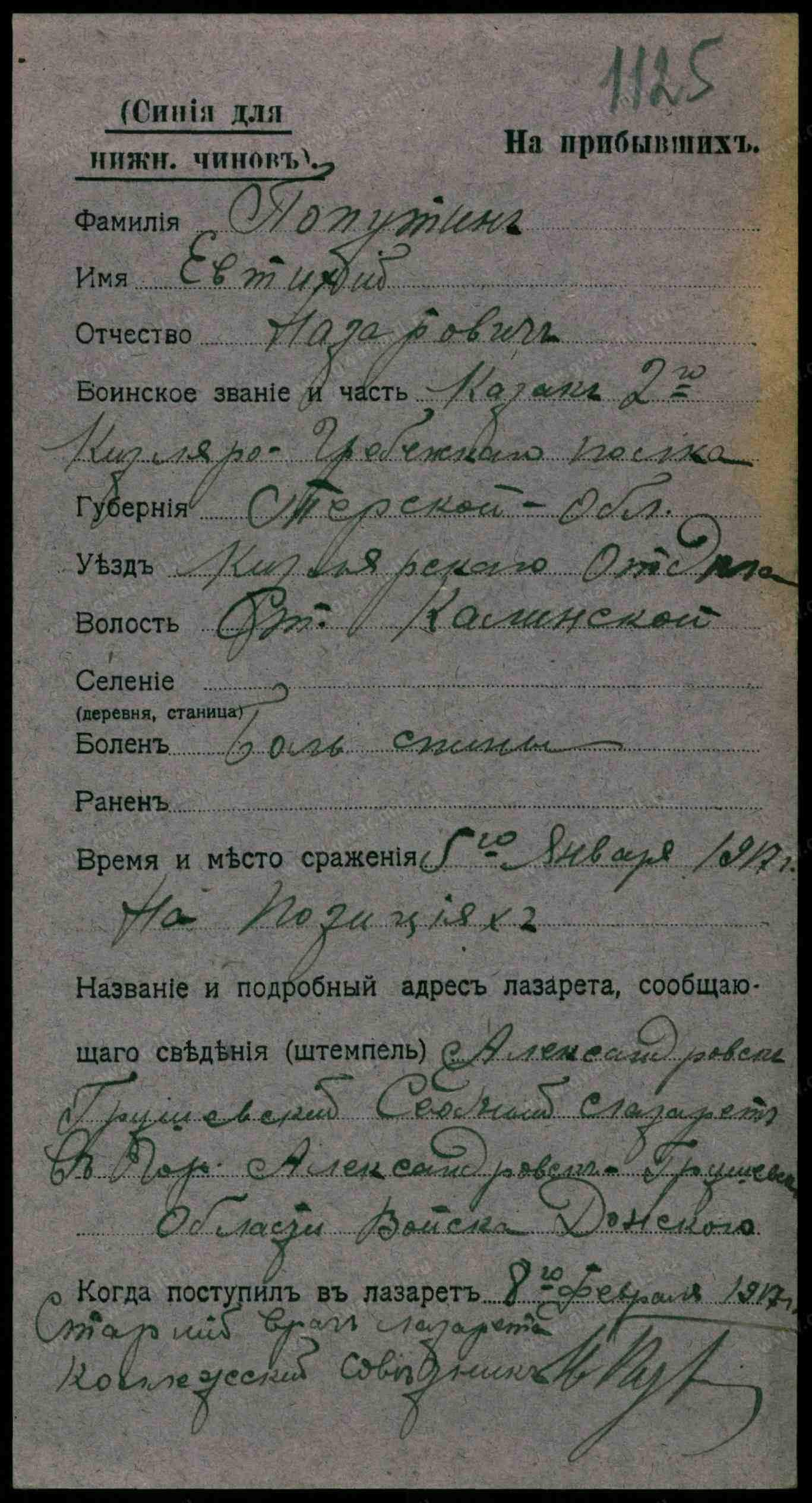 Каз. Поплутин Ефим Александрович, 3 сотня, правос., жен., ст. Калиновской Терской обл., Кизлярского отд., ранен 30 апр. 1915, с. Жукоцин, госпиталь г. Станиславова.