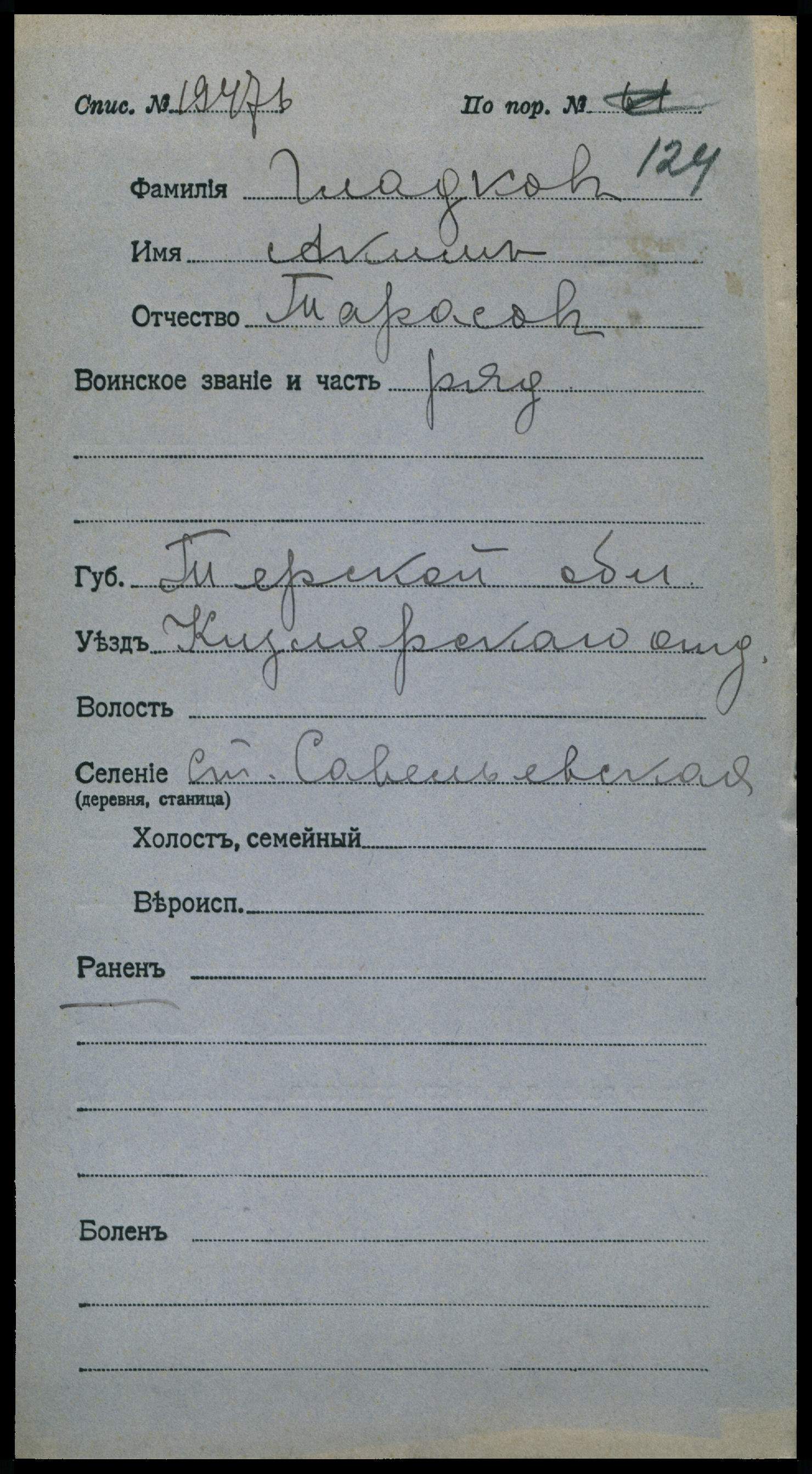 Каз. Гладков Аким Тарасович, старообр., женат, ст. Савельевской Кизлярского отд. Терской обл., ранен 7 марта 1915, с. Зайдекан, лазарет с. Каракилисса, призван по мобилизации.