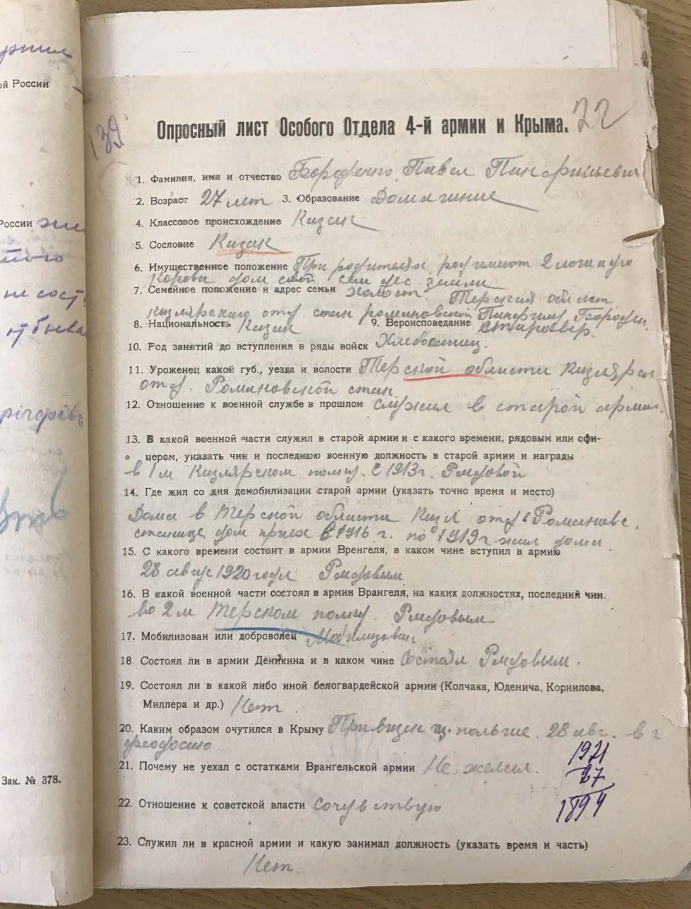 Бороденко Федот Титович, старовер, 3-й Кизляро-Гребенской полк, ст. Романовской Терской обл., выбыл в строй 21 дек. 1915 г. из лазарета г. Грозного.