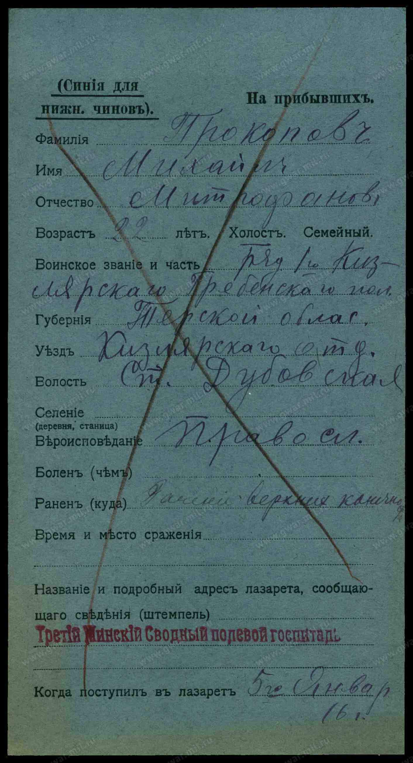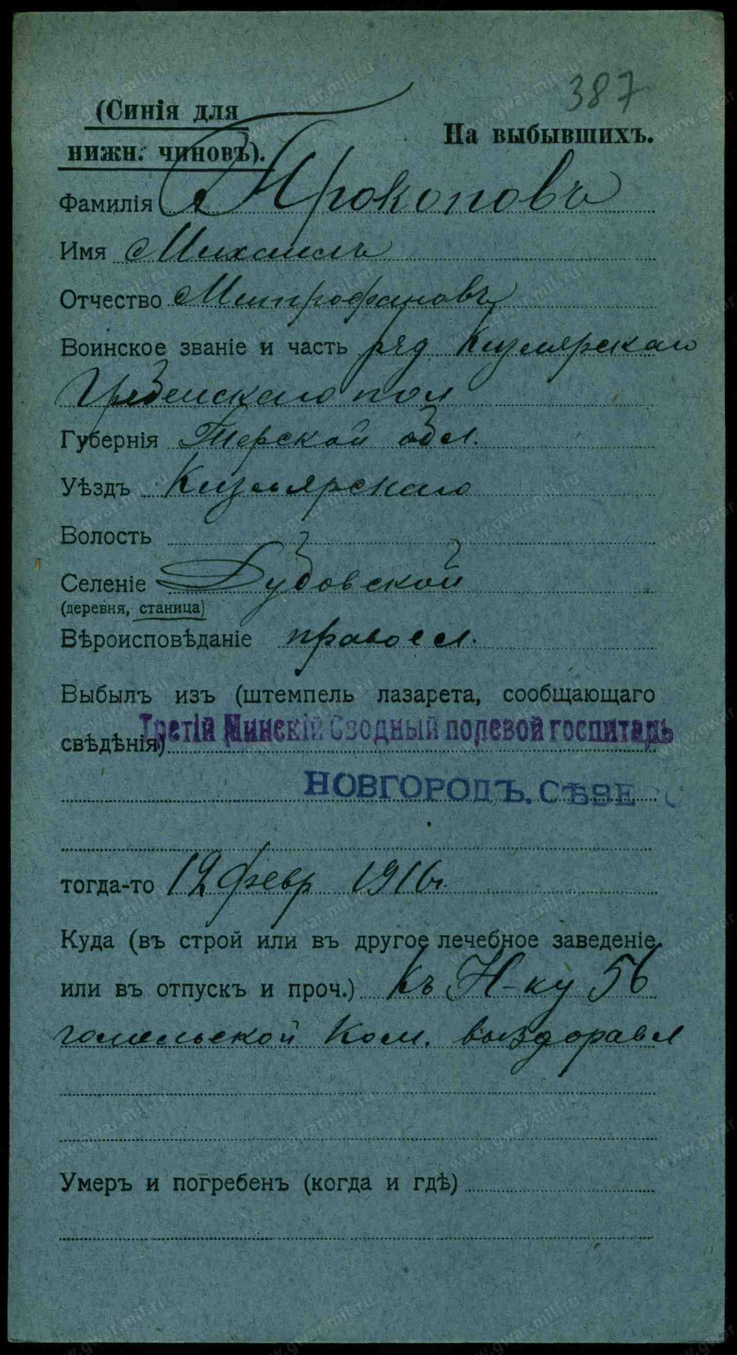 Уроженец ст. Дубовской, Кизлярского отдела, Терской области Прокопов Михаил Митрофанович в 1916 году находился на лечении (от болезни или ранения) в 3-м Минском сводном полевом госпитале, расположенном в г. Новгород-Северск