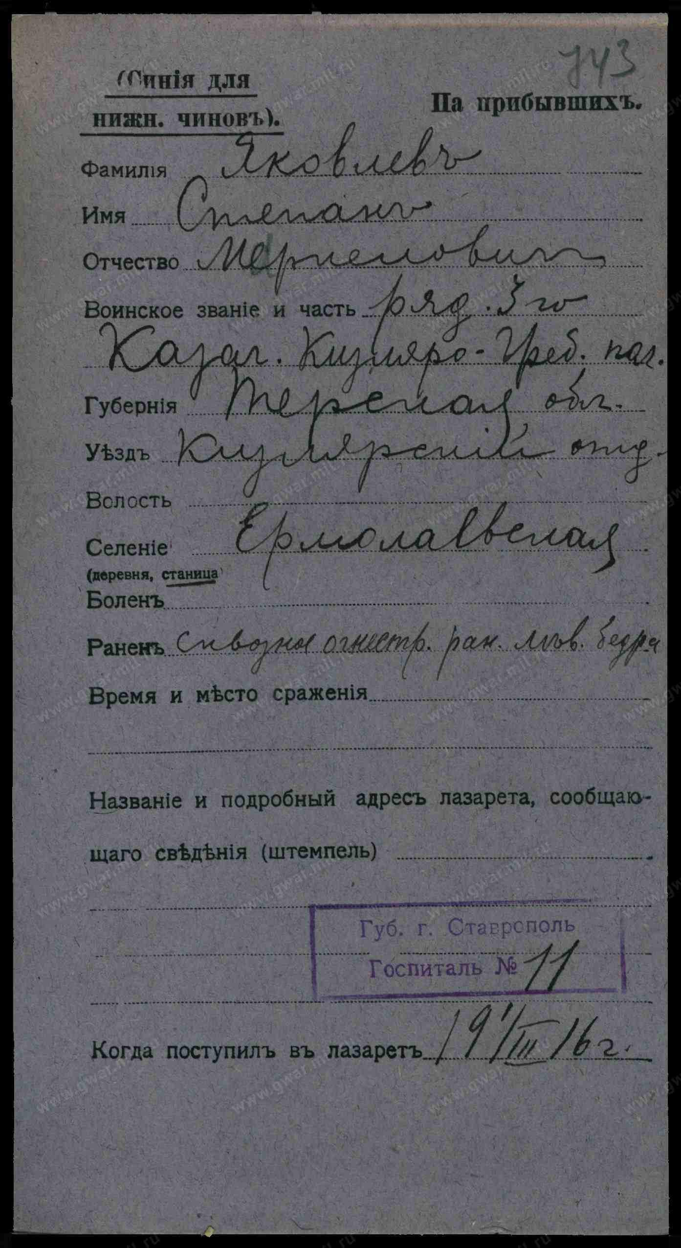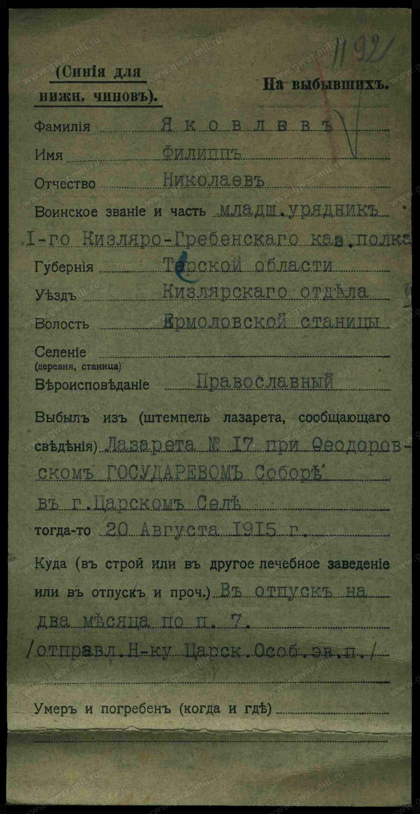 Мл. ур. Яковлев Филипп Николаевич, 1 сотня 1-го Кизляро-Гребенского полка, старообр., жен., ст. Ермоловской, Терской обл., Кизлярского отд., ранен 5 июня 1915 г. у д. Гуры, отправлен в полевой лазарет.