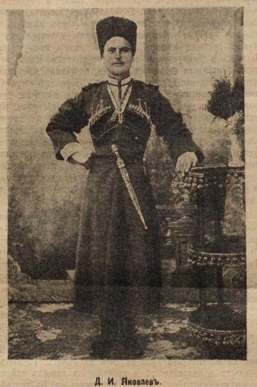 Казак станицы Ермоловской, Терского войска, Кизляро-Гребенского генерала Ермолова полка, старообрядец, 26 лет лет роду, Дмитрий Иванович Яковлев, до настоящей войны служил сначала в конвое Его Величества в Петрограде, а после принимал участие в походе в Персию в 1912 г. В настоящую компанию он находился в составе родного своего полка на юго-западном фронте в Галиции, где в качестве охотника-разведчика неоднократно участвовал в смелых поисках в расположении неприятельских войск и в перестрелках в окопах был легко ранен в руку и ногу, но остался в строю.