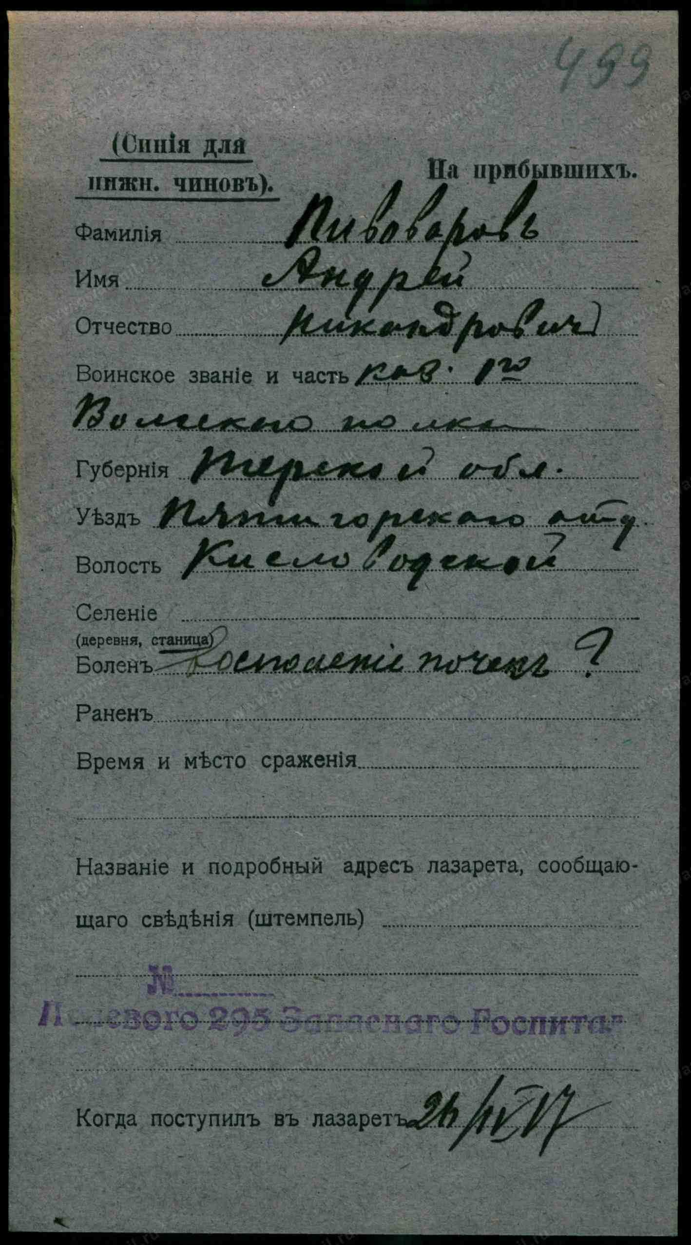 Тип документа Карточка на прибывших (нижние чины)