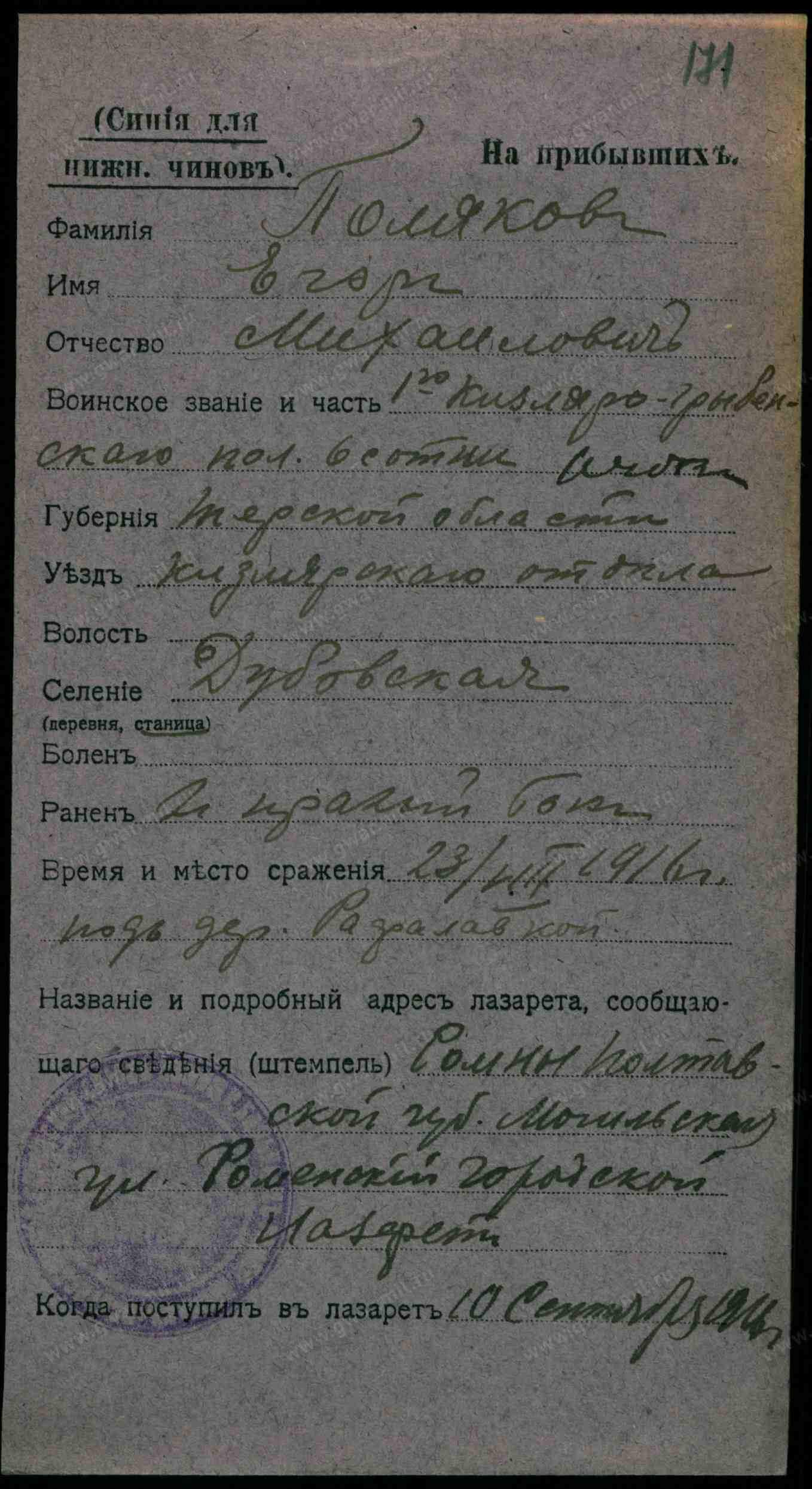 Каз. Георгий Михайлович Поляков, 1-го Кизляро-Гребенского полка, ст. Дубовской, правос., жен., ранен в авг. 1916 г.