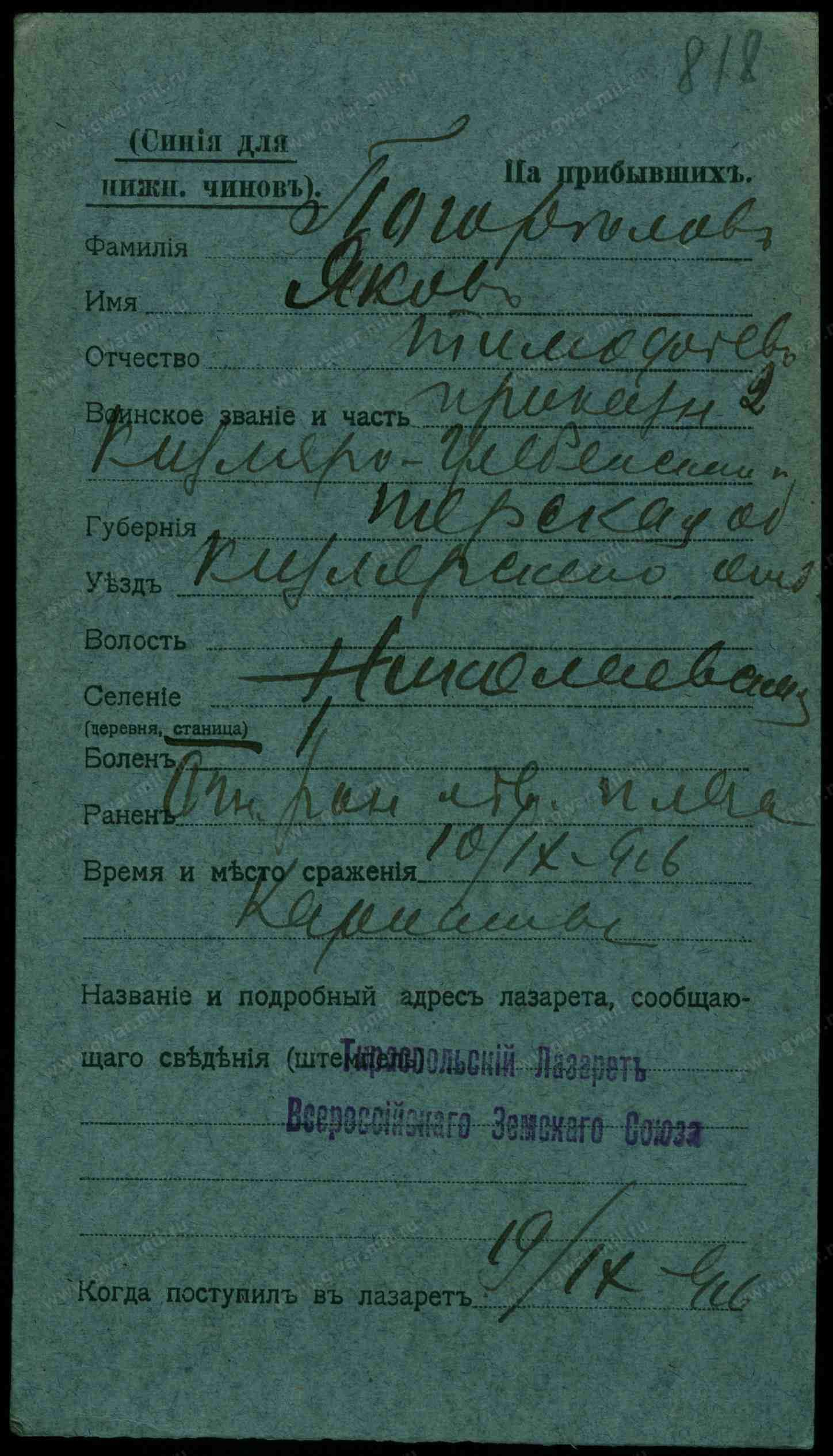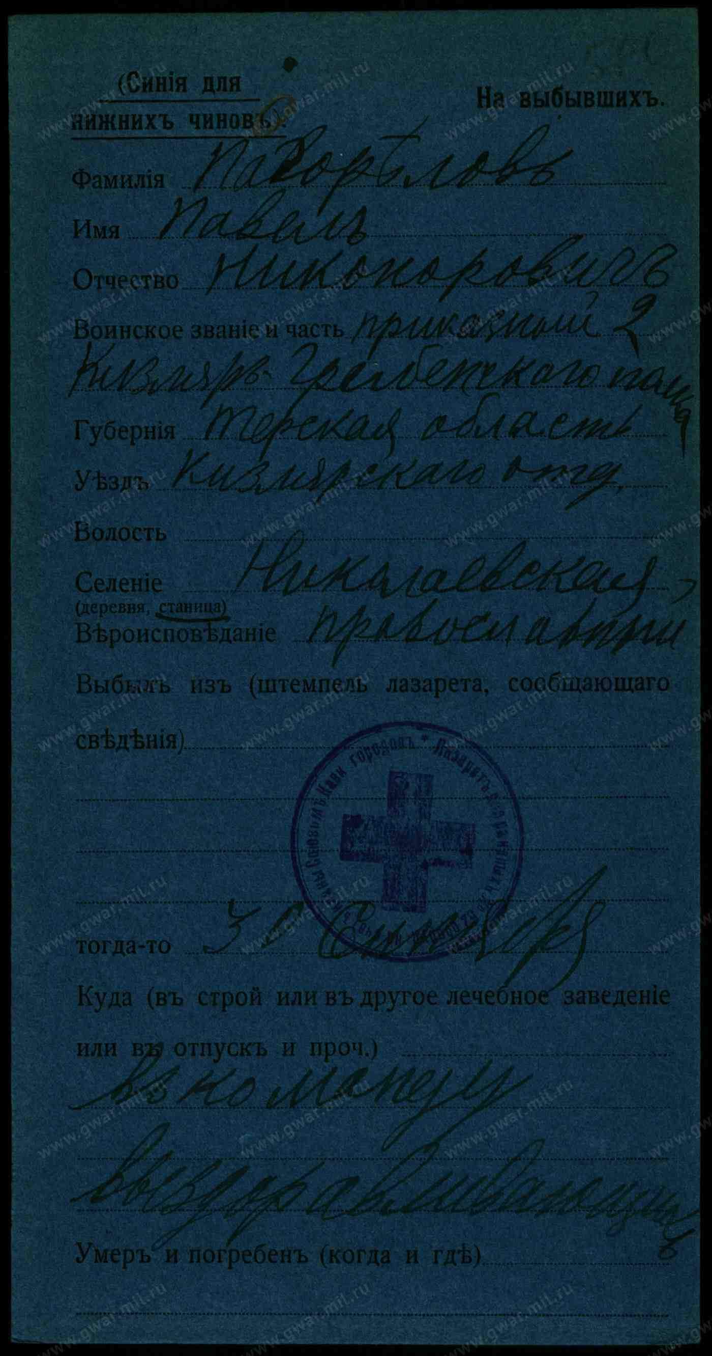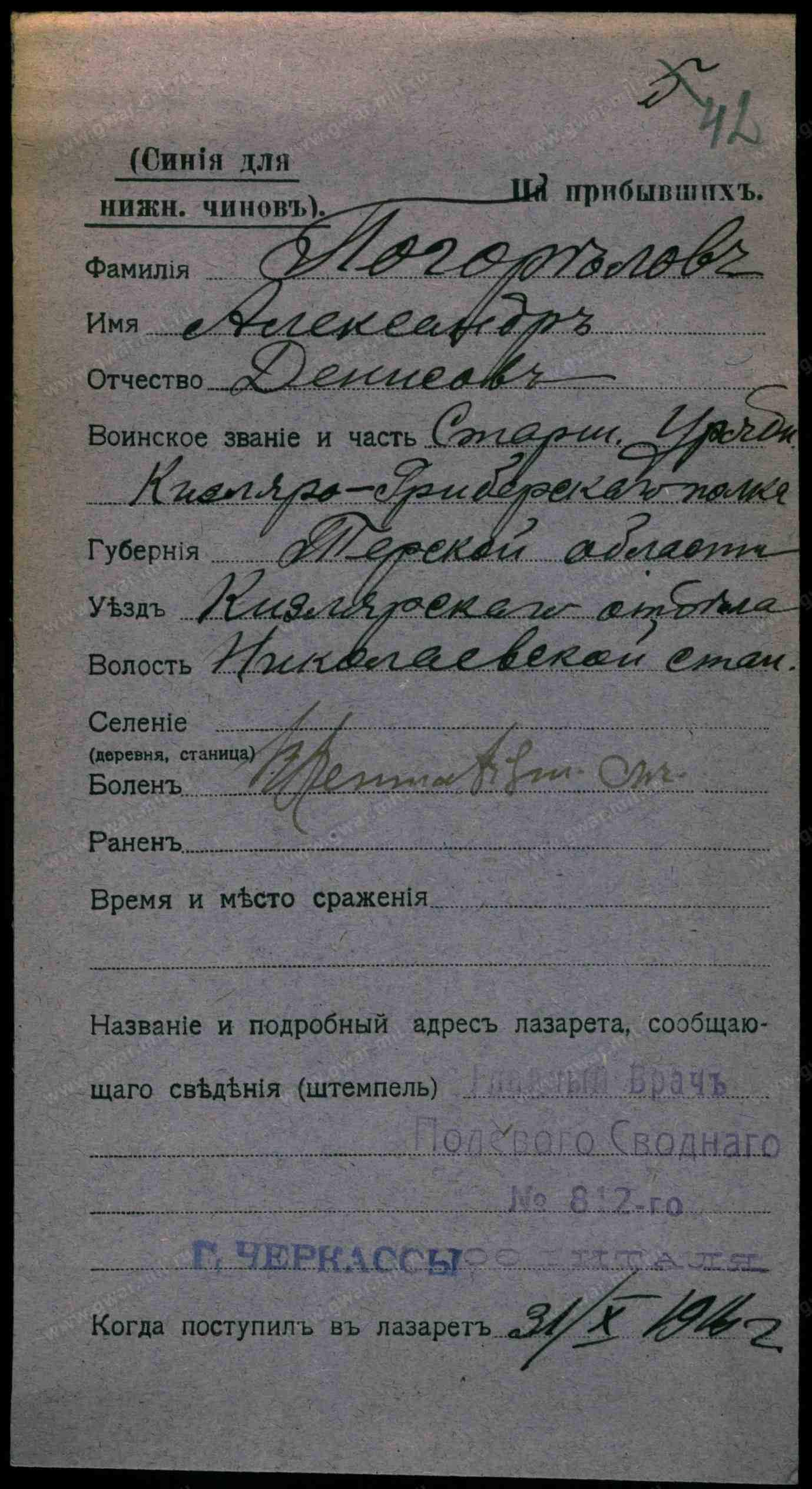 Прик. Погорелов Павел Никонорович, 4 сотня, правос., жен., ст. Николаевской, Терской обл., Кизлярского отд., ранен 25 авг. 1915, с. Дорохов, госпиталь м. Терембовля.