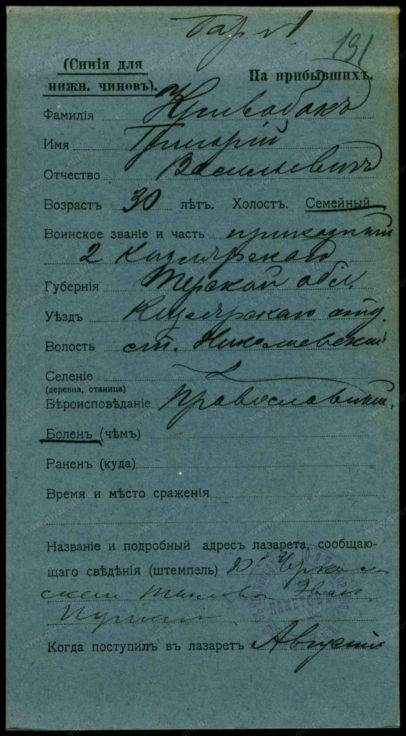 Тип документа Карточка на прибывших (нижние чины)