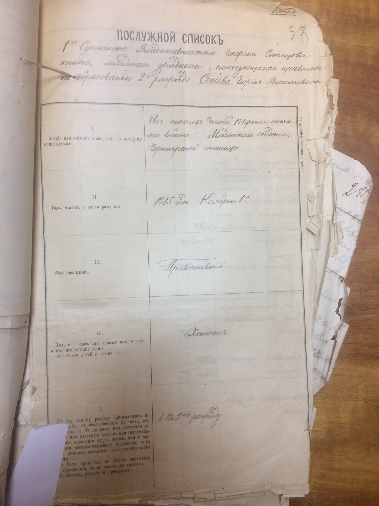 Казак приготовительного разряда 1-го военного отдела Терского казачьего войска, станицы Черноярской, Алексей Васильев Сосиев, имеющий от роду 20 лет, выдержавший испытание по программе, установленной для приема в регулярные войска вольноопределяющимся 3-го разряда, - согласно поданного им на Высочайшие имя прошение, с представлением установленных документов, и на основании 39-й и 40-й ст. Устава о воинской повинности казаков войска Донского, Высочайше утвержденного 17 апреля 1875 года, зачисляется на службу в 1-й Волгский конный полк казаком на правах по образованию третьего разряда.