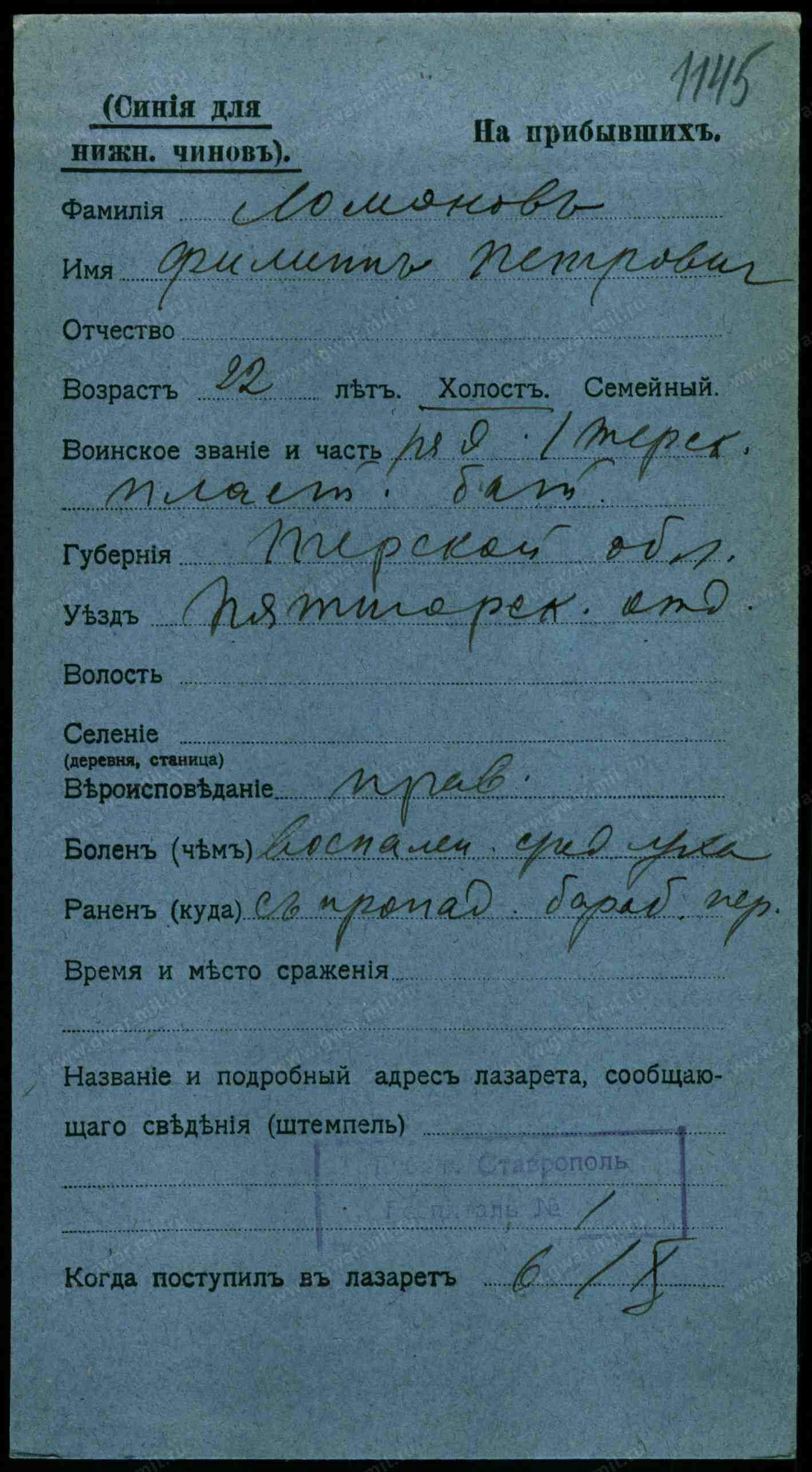 Ст. сержант, __.__.1896 Ставропольский край, г. Ессентуки. Сводная картотека