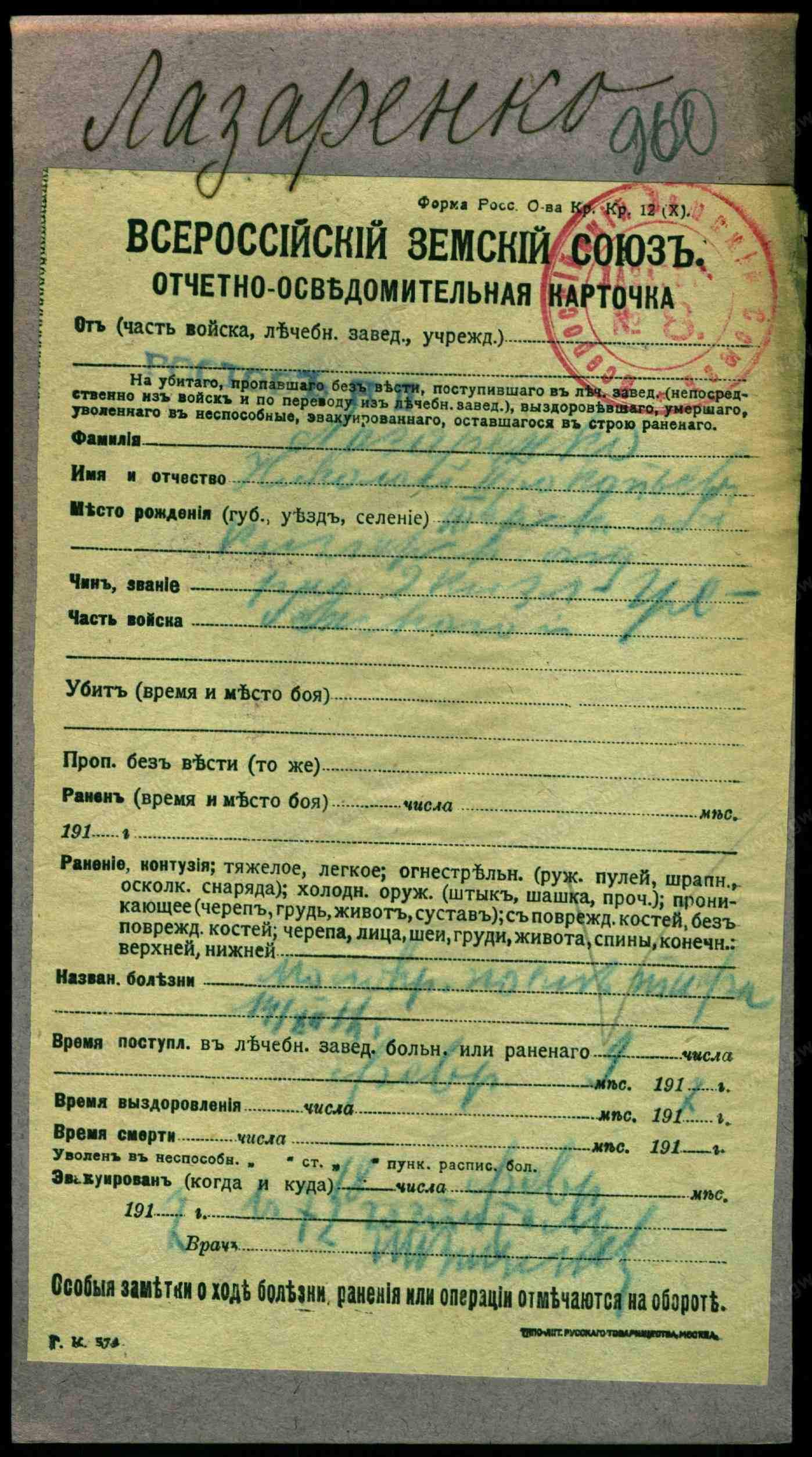 Каз. Лазаренко Николай Прохорович, 1 сотня, правос., жен., ст. Романовской Терской обл. Кизлярского отд., ранен 29 сент. 1915 г., с. Соколово, отправлен госпиталь м. Трембовля.