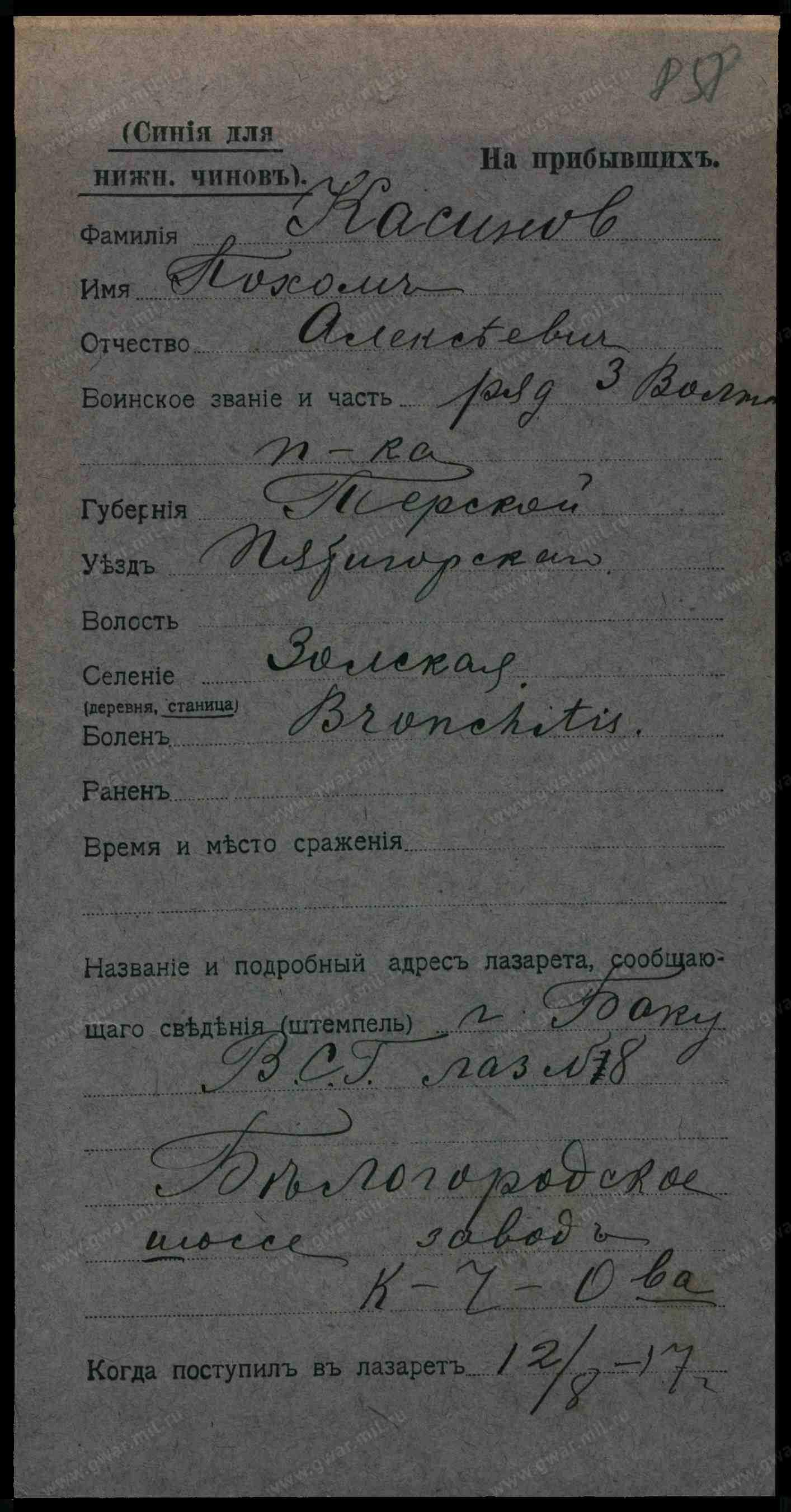 КАСИНОВ Иван — 1 Волгский каз. Его Императорского Высочества Наследника Цесаревича полк, мл. урядник. За отличие в бою 11.12.1914 у с. Ветржно.